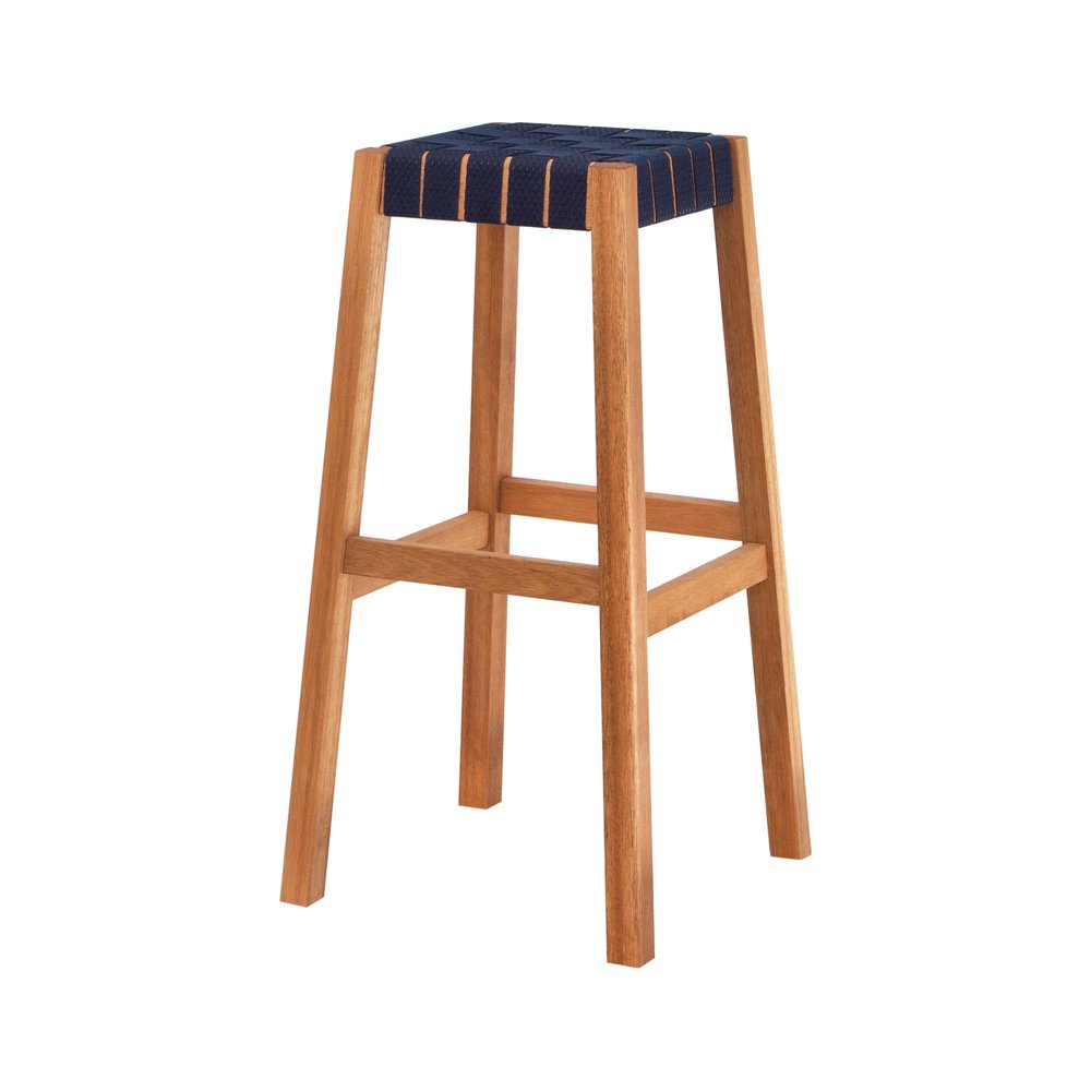 O Banco Alto Fita Garden Natural/Azul da Decorise combina a rusticidade da madeira de eucalipto com o charme do assento trançado, criando uma peça que alia design contemporâneo, resistência e leveza em diferentes espaços da casa.