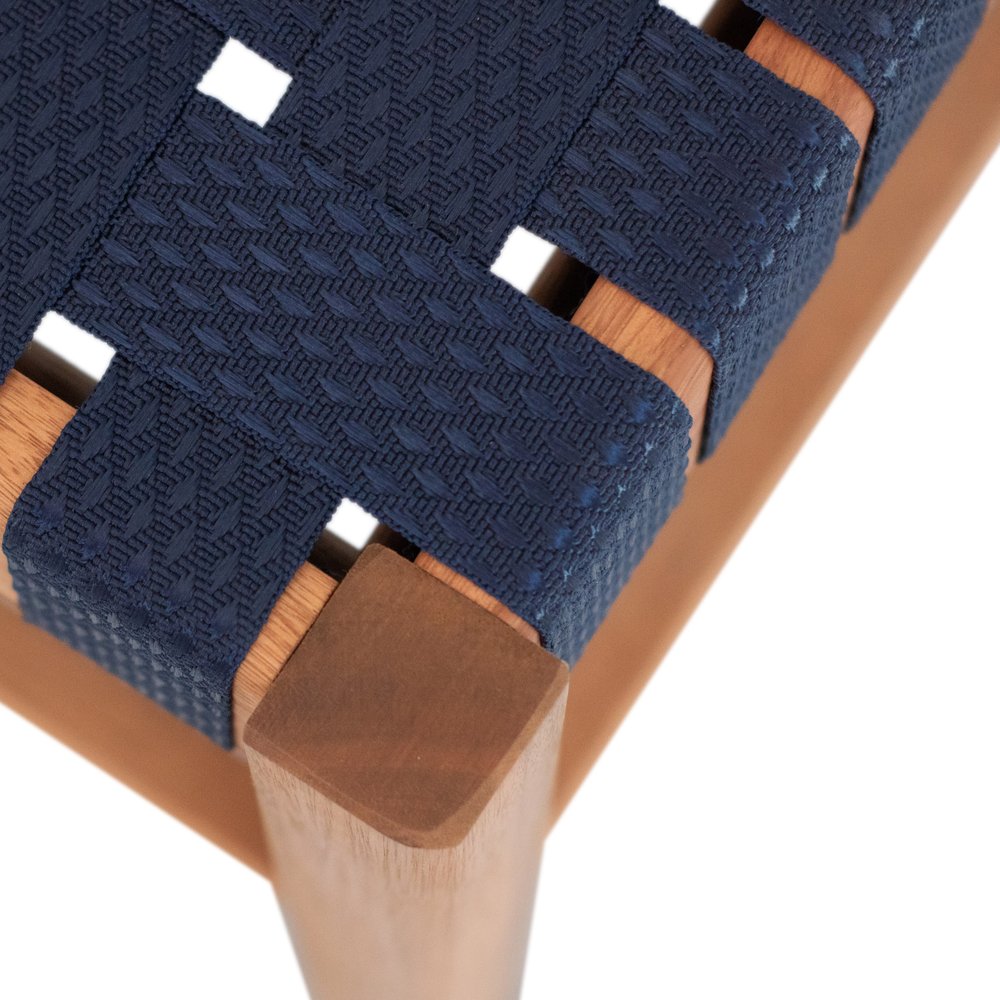 O assento trançado abraça suavemente o corpo, distribuindo o peso de forma equilibrada e evitando pontos de pressão. A madeira de eucalipto, além de resistente, recebe tratamento para evitar empenamento e danos causados pela umidade.