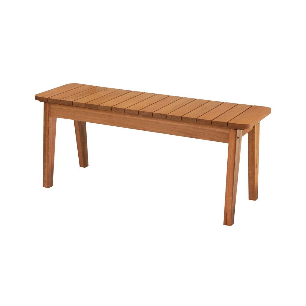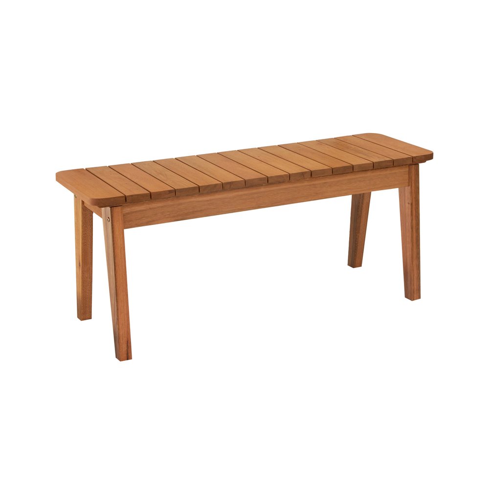 A estrutura do banco é confeccionada em madeira de eucalipto, conhecida por sua durabilidade e resistência às variações climáticas. A tonalidade natural da madeira proporciona um visual acolhedor e sofisticado, adaptando-se facilmente a diferentes ambientes.