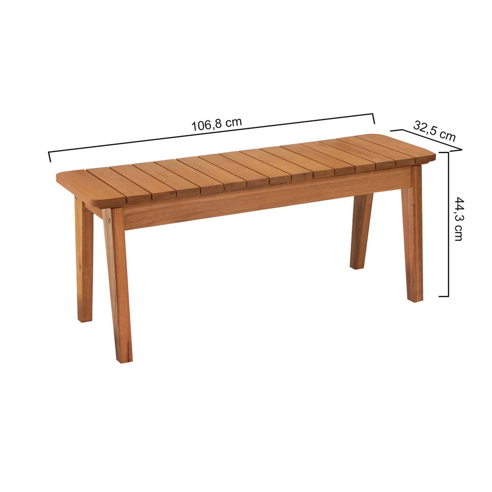 O banco possui as seguintes medidas: 106,8 cm de largura, 32,5 cm de profundidade e 44,3 cm de altura. Com peso de 8,5 kg, é fácil de movimentar e reposicionar conforme a necessidade. Sua capacidade de peso é de até 200 kg, proporcionando segurança e conforto para dois usuários.