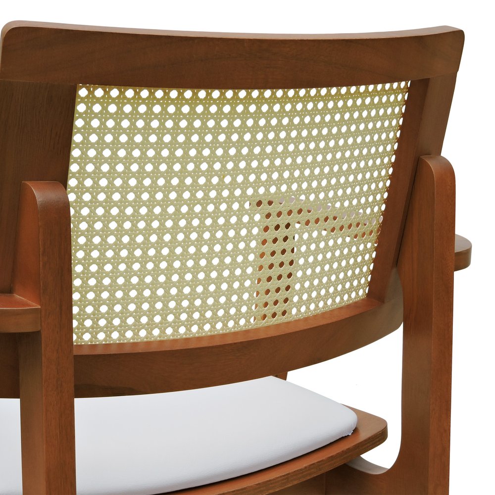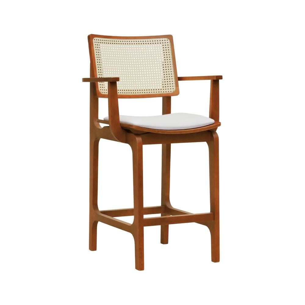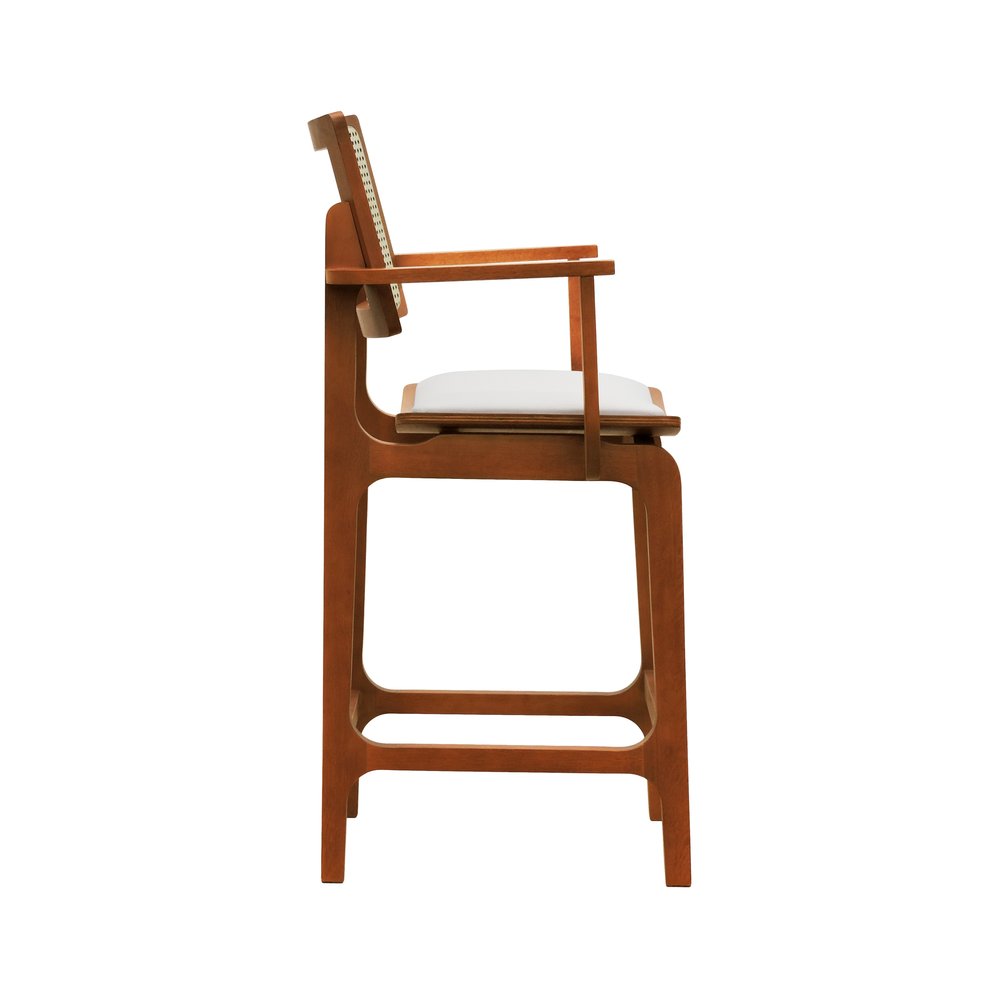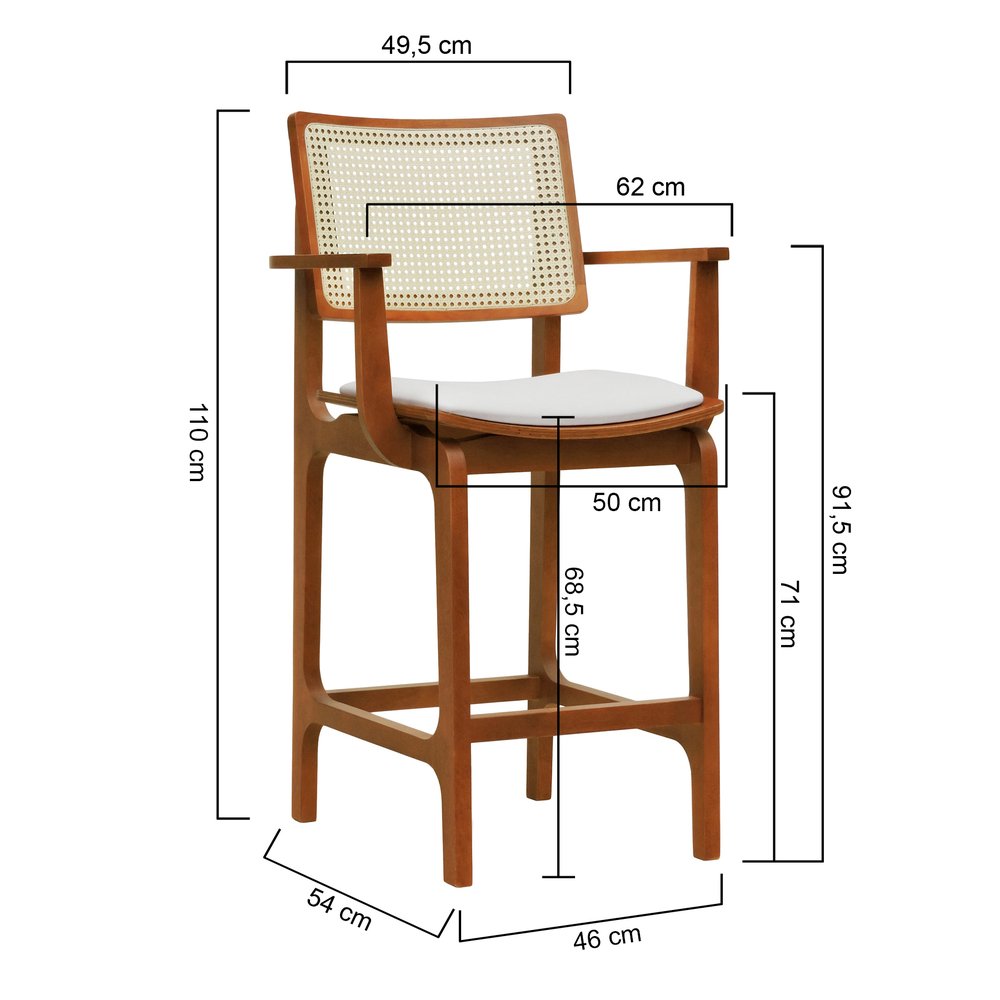 Banqueta Alta Bistrô Gus com Braços Madeira Maciça Encosto Telinha Assento Anatômico - Amêndoa Estofado Corano Bege