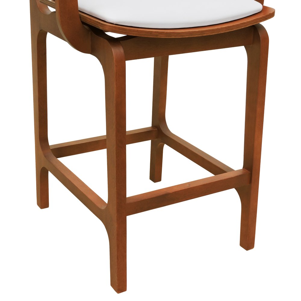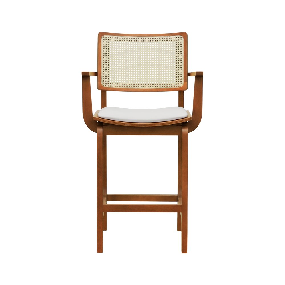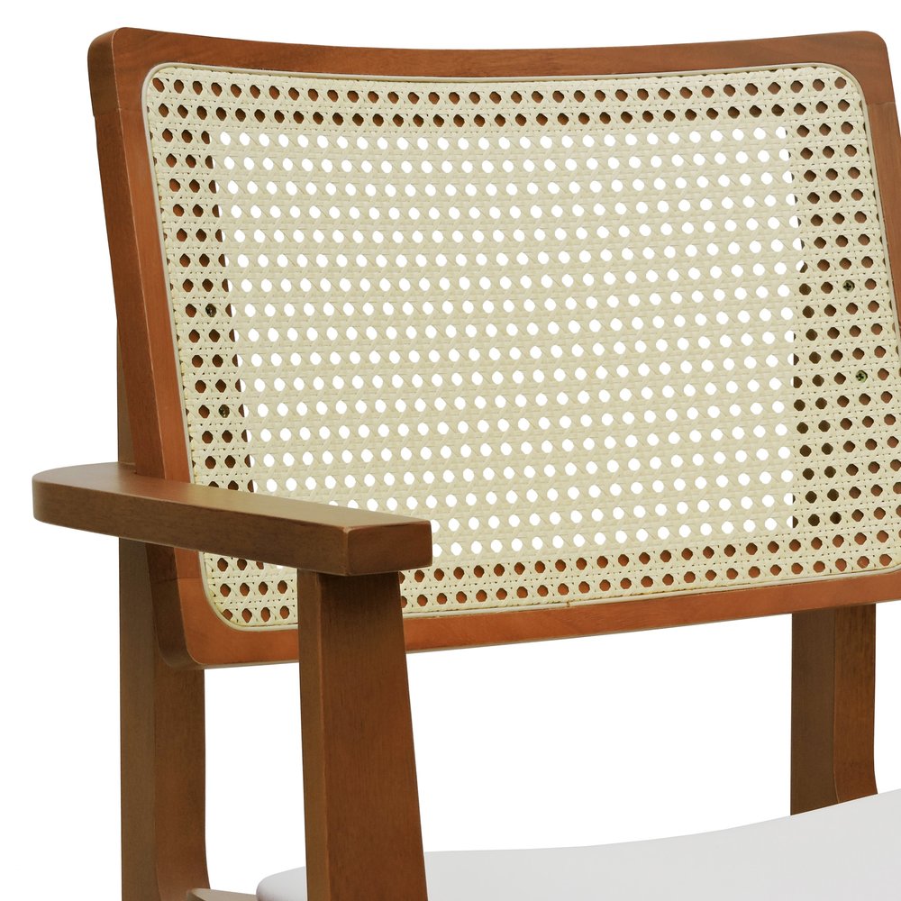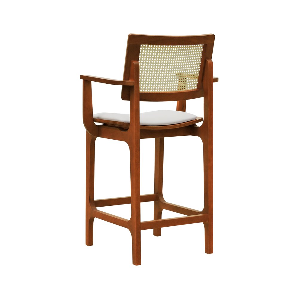 Banqueta Alta Bistrô Gus com Braços Madeira Maciça Encosto Telinha Assento Anatômico - Amêndoa Estofado Corano Bege