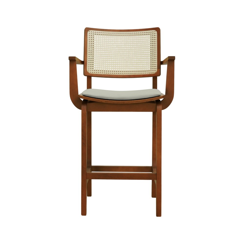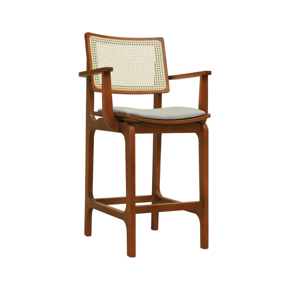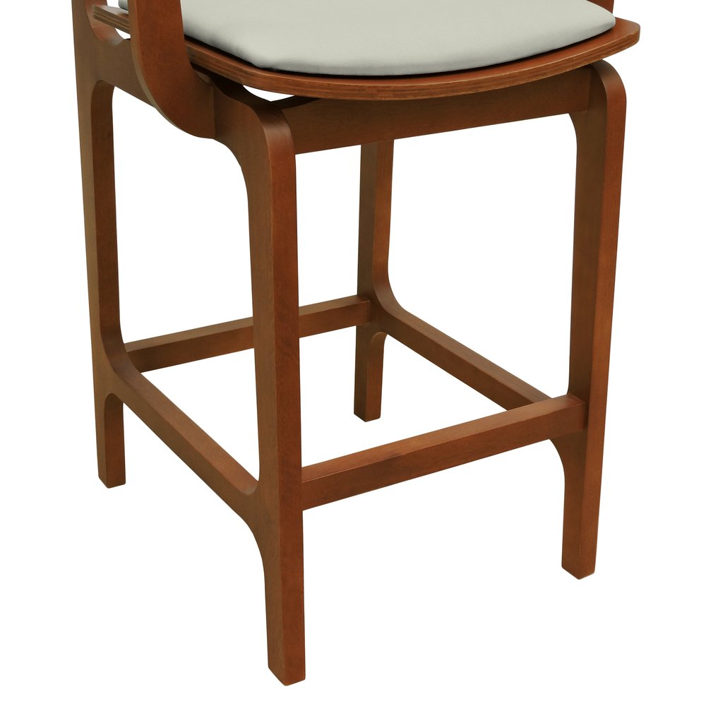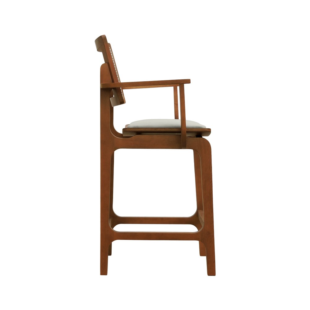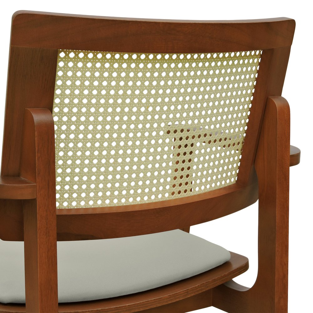 Banqueta Alta Bistrô Gus com Braços Madeira Maciça Encosto Telinha Assento Anatômico - Amêndoa Estofado Linho Bege