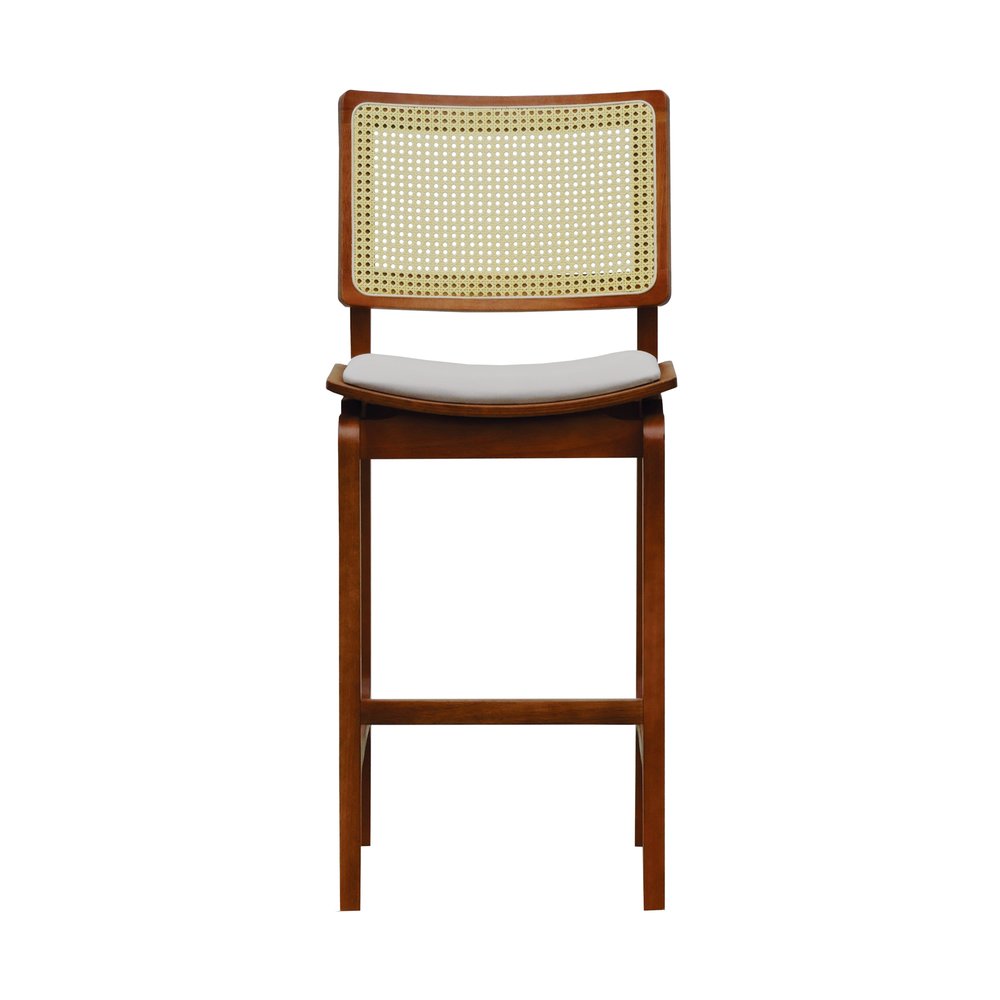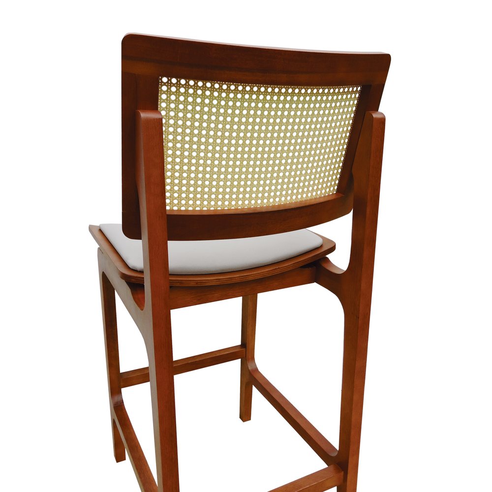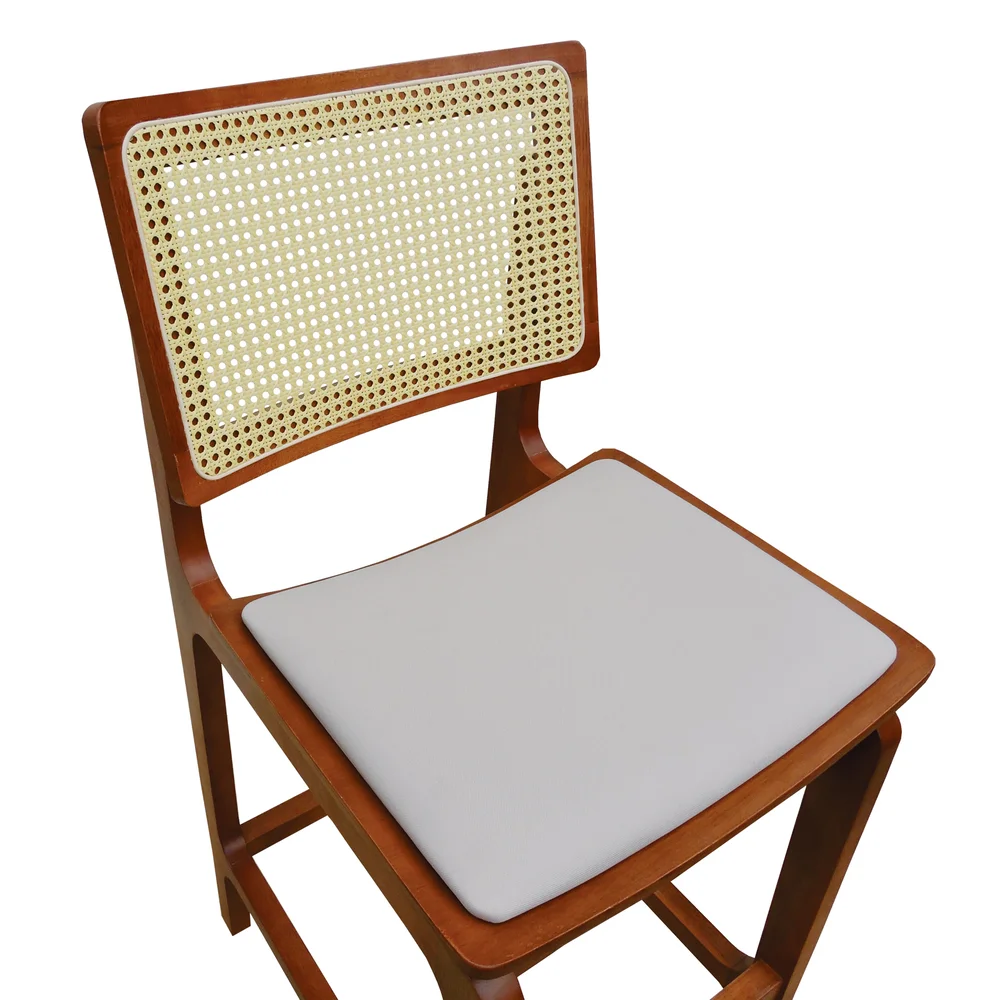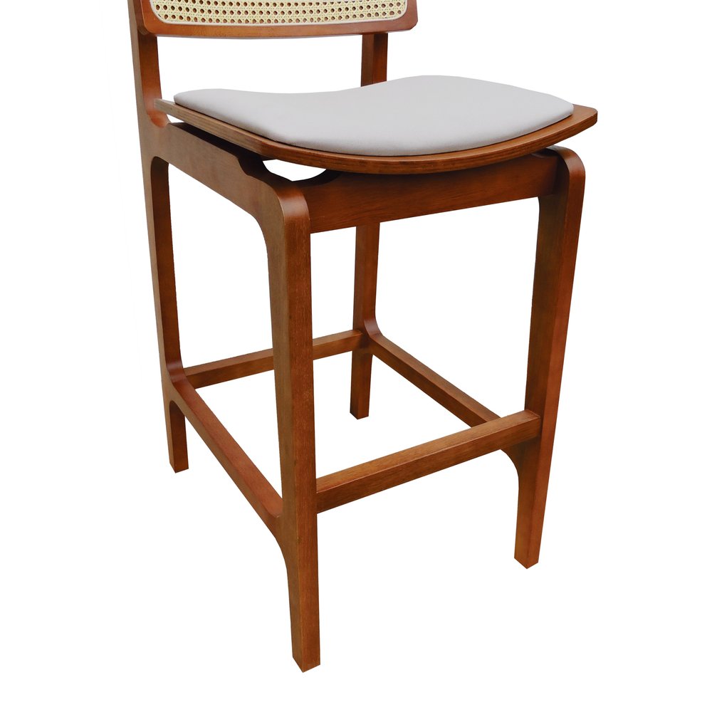 O grande diferencial dessa banqueta está no encosto em telinha, que além de agregar leveza visual, valoriza a ventilação e o charme artesanal. Já o assento anatômico com estofamento em linho traz conforto no uso prolongado, permitindo uma experiência ergonômica sem abrir mão da elegância.