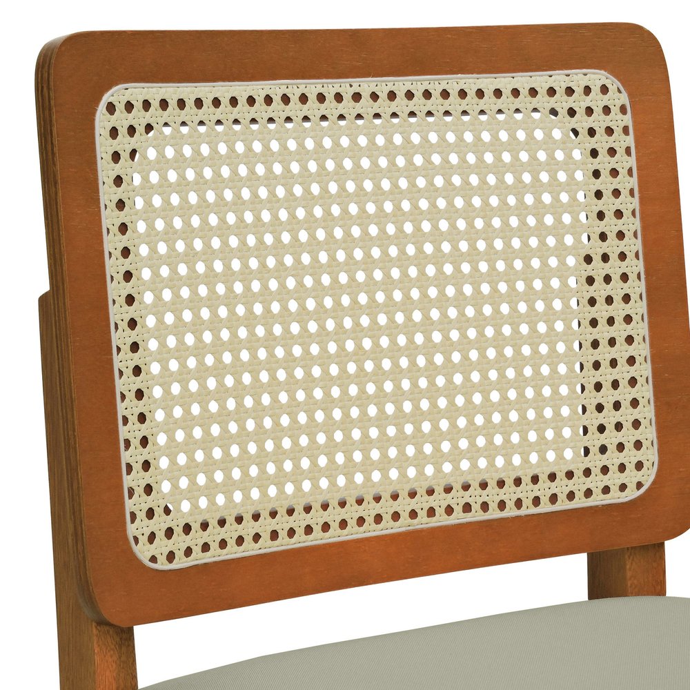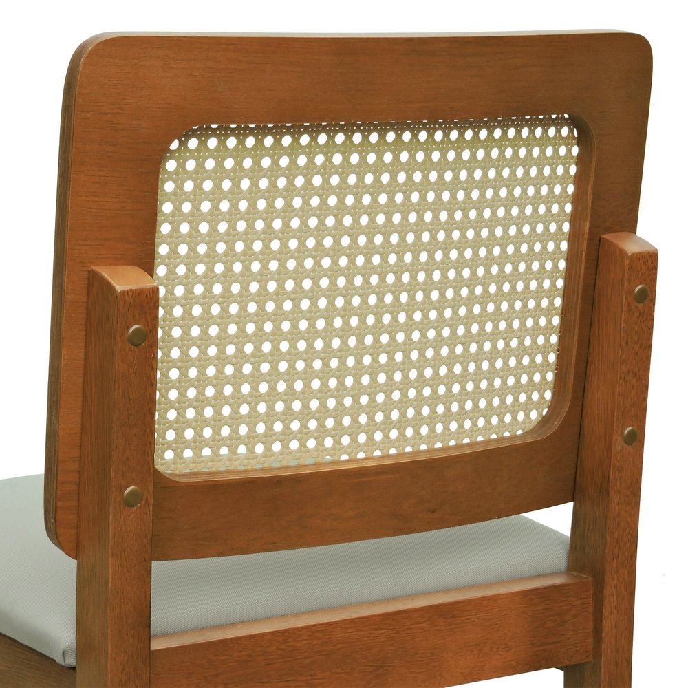 Seu encosto em telinha natural garante leveza visual e conforto térmico, favorecendo a circulação de ar e criando um contraste elegante com a estrutura da madeira. O assento estofado em linho bege, além de visualmente acolhedor, proporciona uma base macia e ergonômica, ideal para o uso prolongado em refeições, encontros ou momentos de relaxamento. O tom neutro do tecido permite composições com diversos estilos de decoração, desde os mais rústicos até os contemporâneos.