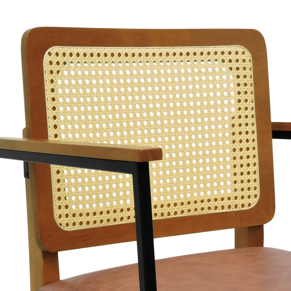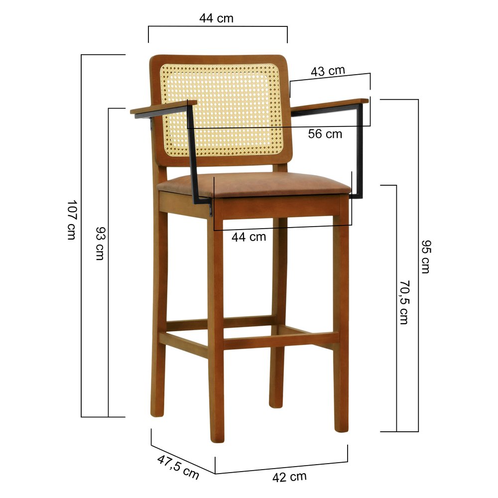 A estrutura da banqueta é composta por madeira de eucalipto maciço, garantindo resistência e estabilidade. O assento estofado, com espuma D26 e revestido em corano, proporciona conforto ergonômico, enquanto o encosto anatômico com telinha sextavada na cor natural oferece ventilação e apoio adequado para as costas. Os braços em metal com apoio em madeira maciça adicionam um toque de sofisticação e funcionalidade.