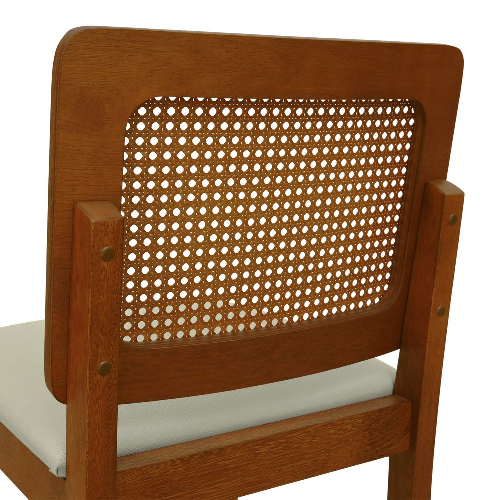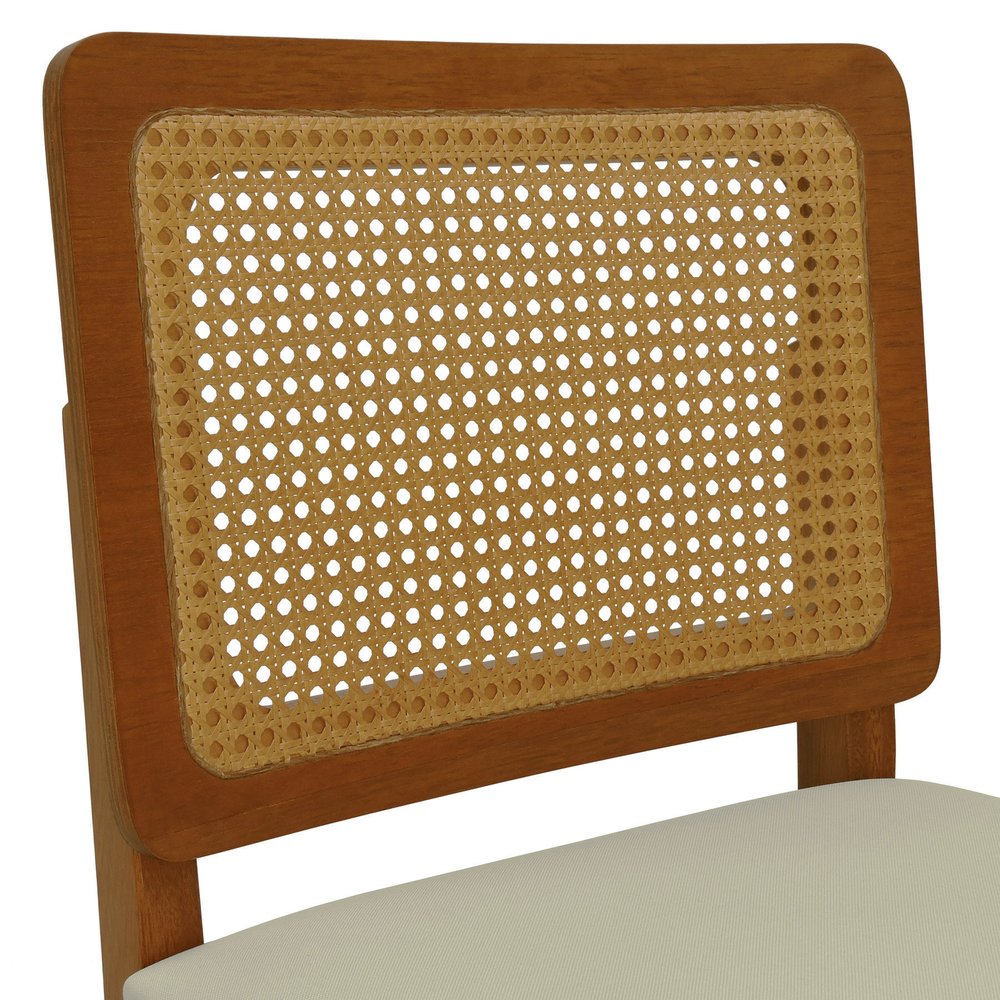 Produzida em madeira maciça de eucalipto com acabamento amêndoa, a banqueta apresenta uma estrutura resistente e durável. O encosto em telinha sextavada na cor natural proporciona ventilação e um toque rústico, enquanto o assento estofado em linho bege oferece conforto e fácil manutenção.