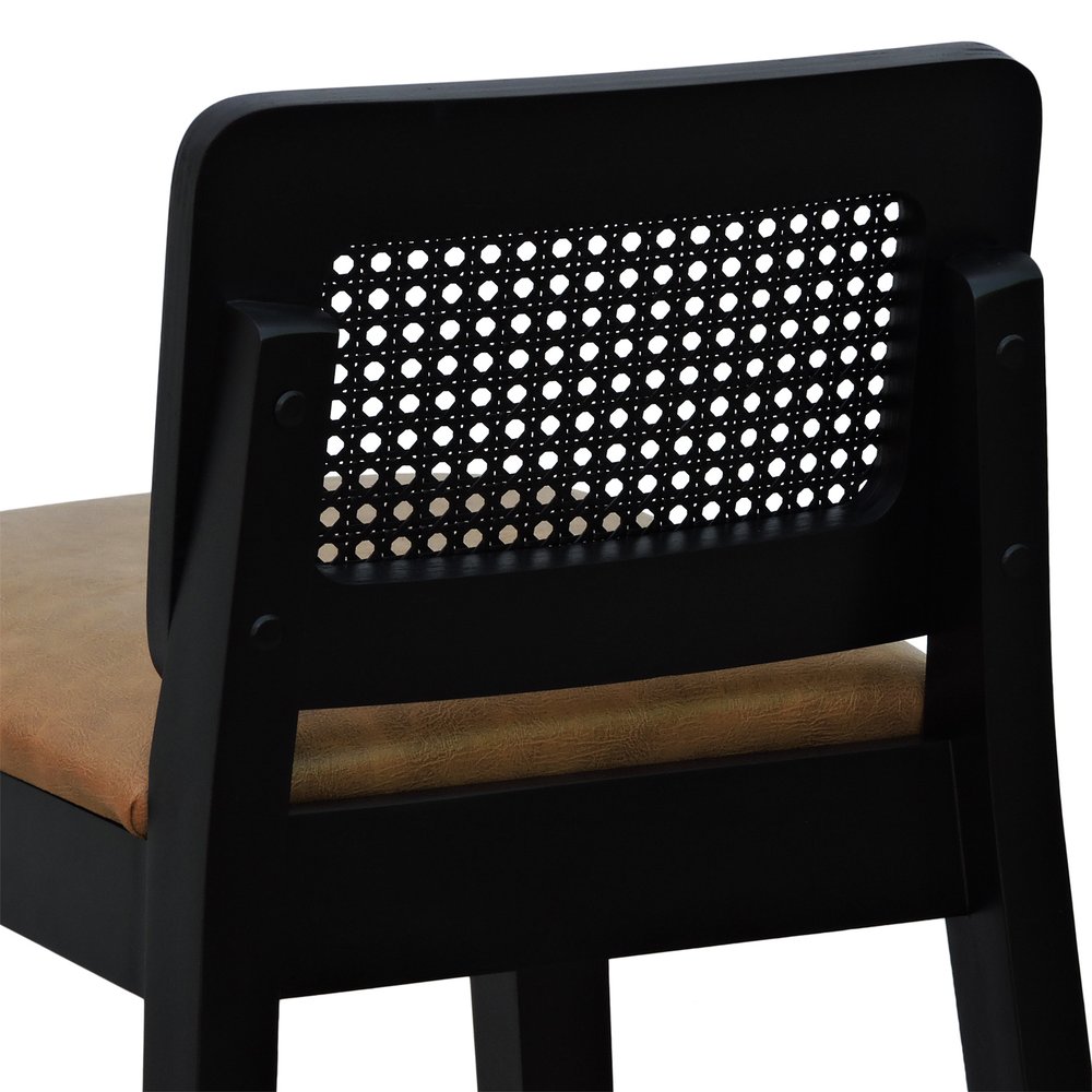 O encosto em telinha natural é um dos seus principais atrativos, oferecendo um toque artesanal ao design e garantindo conforto térmico e leveza visual. A estrutura firme e bem acabada complementa o assento estofado em corano marrom mescla, um material que se destaca por sua resistência, facilidade de limpeza e aparência sofisticada. A tonalidade do estofado harmoniza muito bem com o preto da madeira, criando um contraste equilibrado e acolhedor.