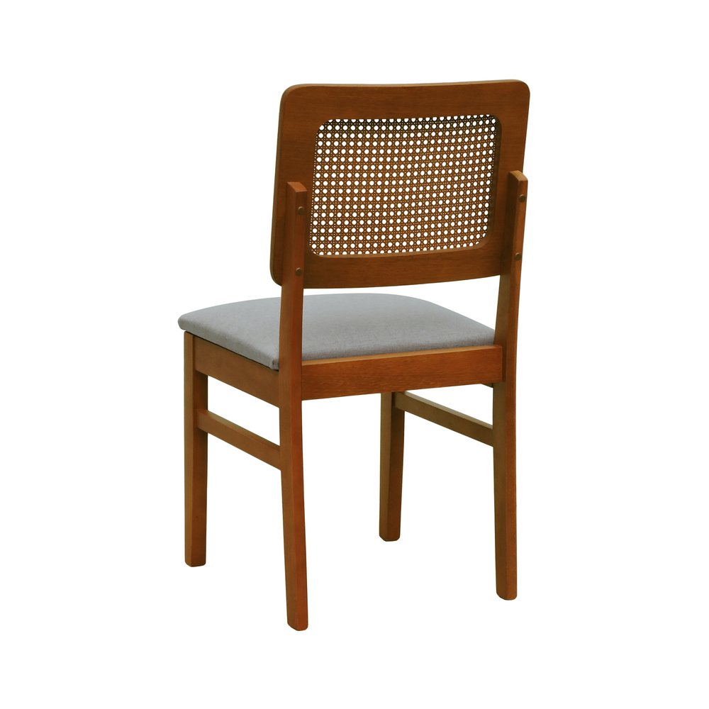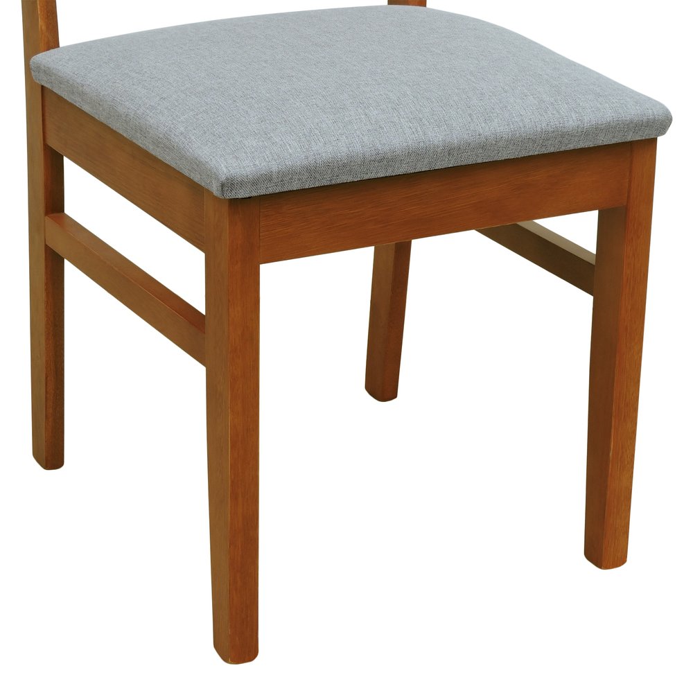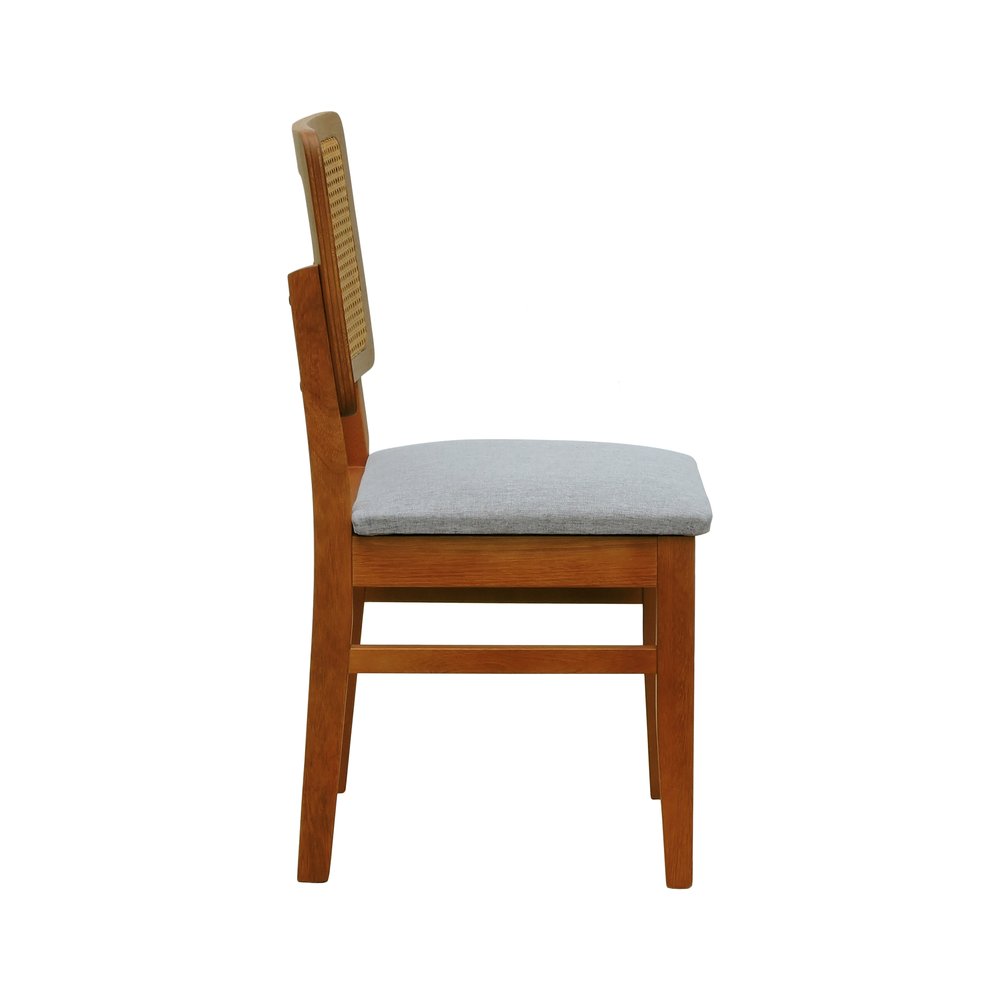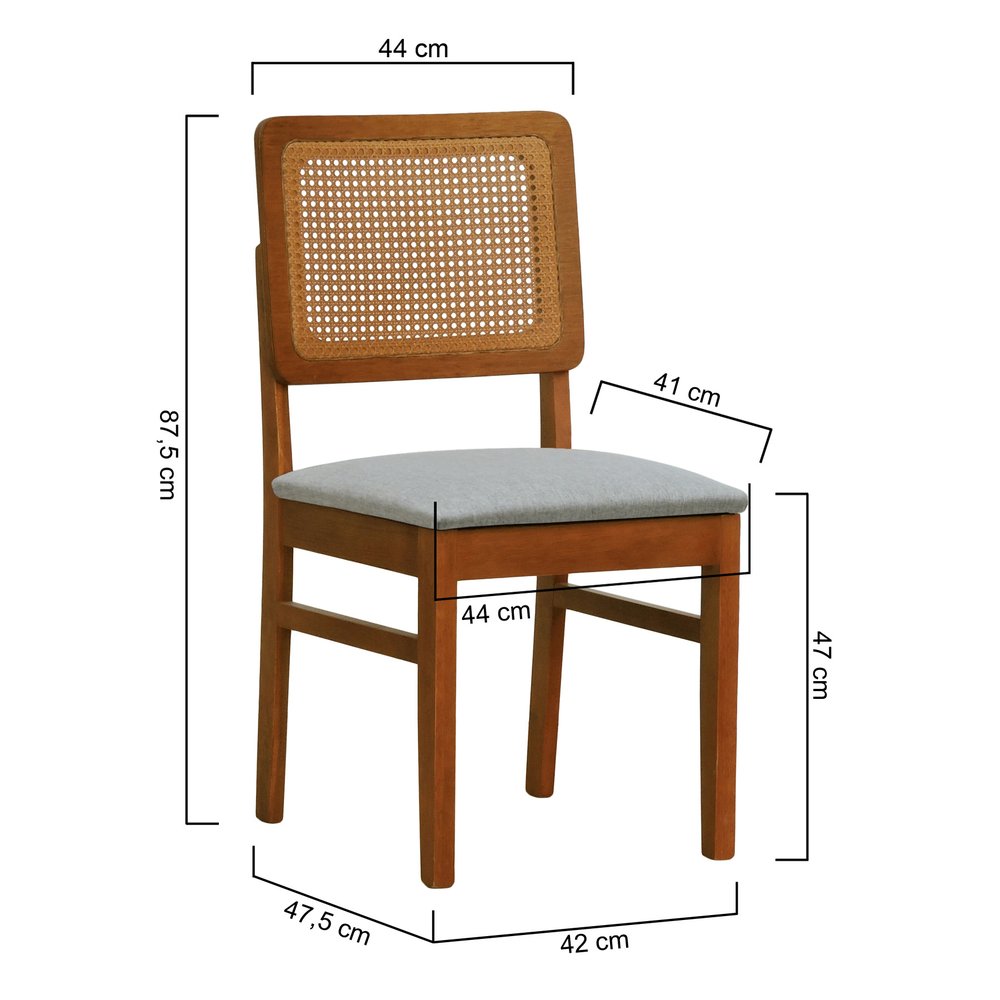 A Cadeira Lyon possui as seguintes dimensões: largura de 44 cm, profundidade de 47,5 cm e altura de 87,5 cm. Ela suporta até 120 kg, garantindo estabilidade e segurança. O peso do produto é de 6,5 kg, facilitando o manuseio e a movimentação. A estrutura em madeira de eucalipto maciça é tratada para realçar seus veios naturais, enquanto o assento estofado em linho cinza mescla impermeável facilita a limpeza e manutenção.