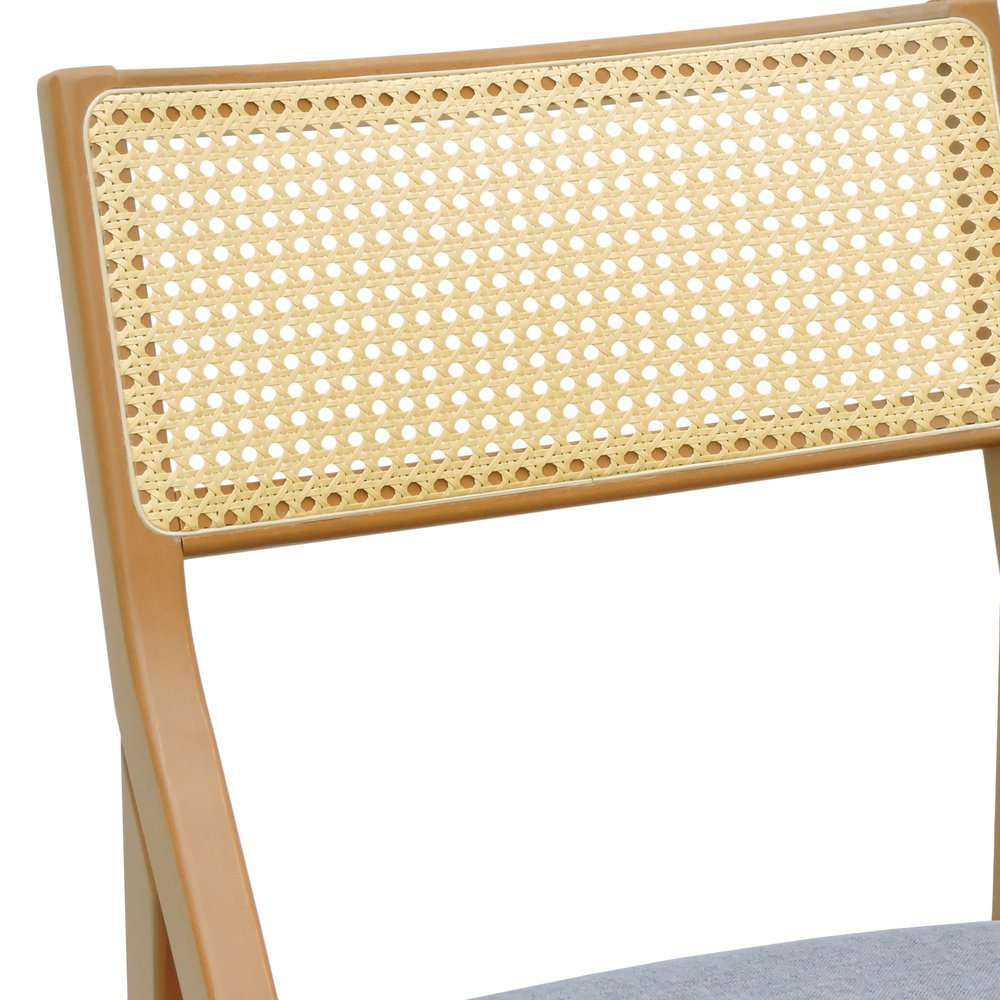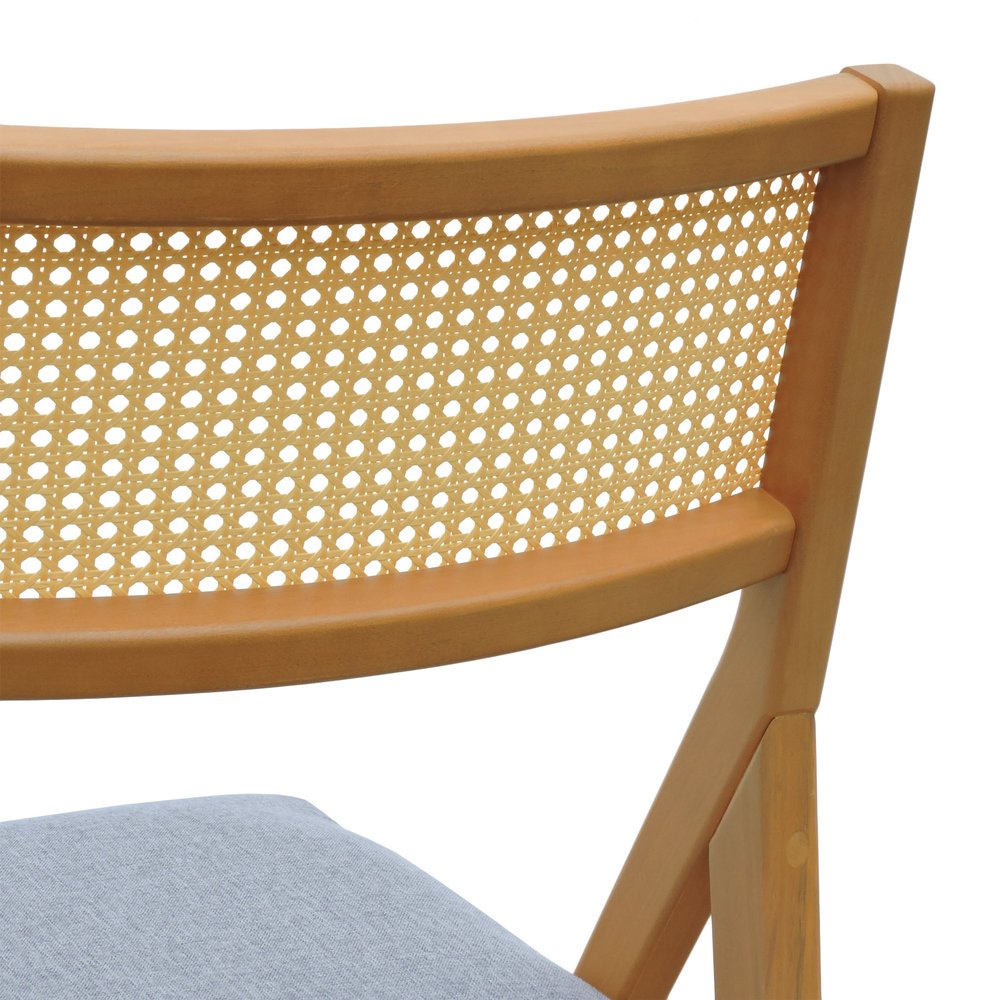 A estrutura é produzida em madeira de eucalipto maciça tingida na cor natural, garantindo alta resistência mecânica e aspecto uniforme em todo o móvel. O encosto em telinha sextavada natural proporciona ventilação e leveza ao design, além de reforçar o apelo artesanal e contemporâneo da peça.