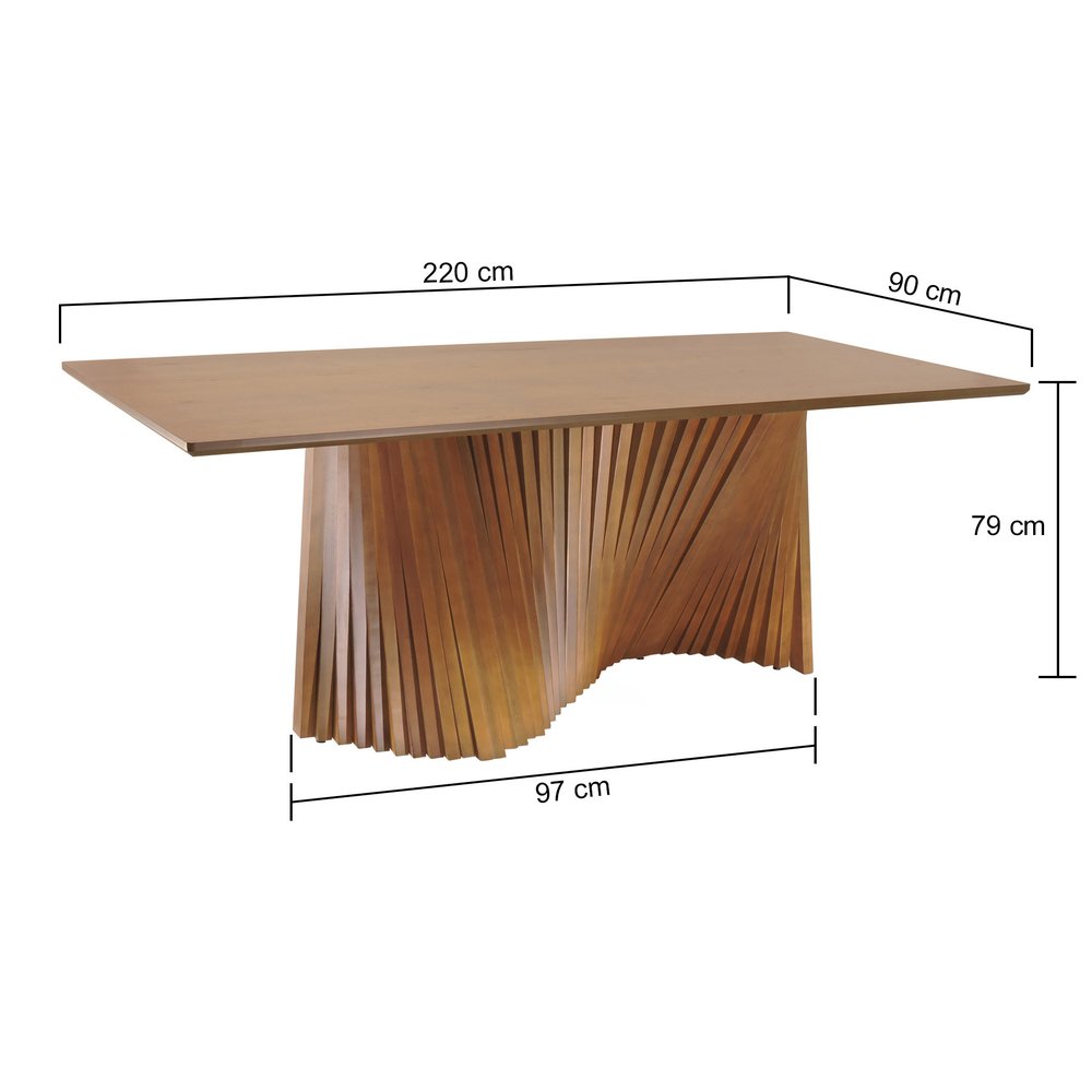 Transforme seu ambiente com o conjunto de mesa de jantar Dubai e 8 cadeiras Quéops. A mesa conta com um elegante tampo em MDF laminado com lâmina de cinamomo de 220x90cm tingido na cor amêndoa, oferecendo resistência, estilo e um toque natural ao espaço. Sua base moderna proporciona estabilidade e um visual imponente.