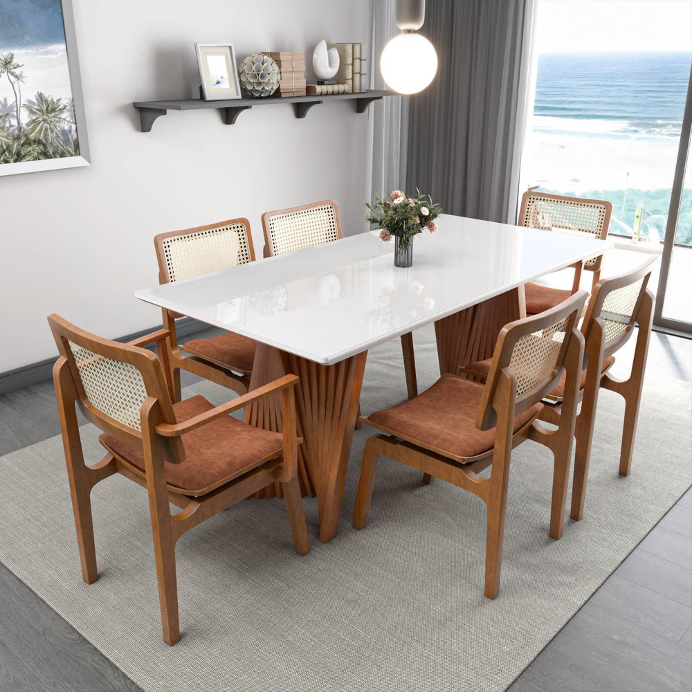 Conjunto Mesa de Jantar Gus com Vidro 180x90cm Com 4 Cadeiras Gus Sem Braços e 2 Cadeiras Gus Com Braços – Amêndoa