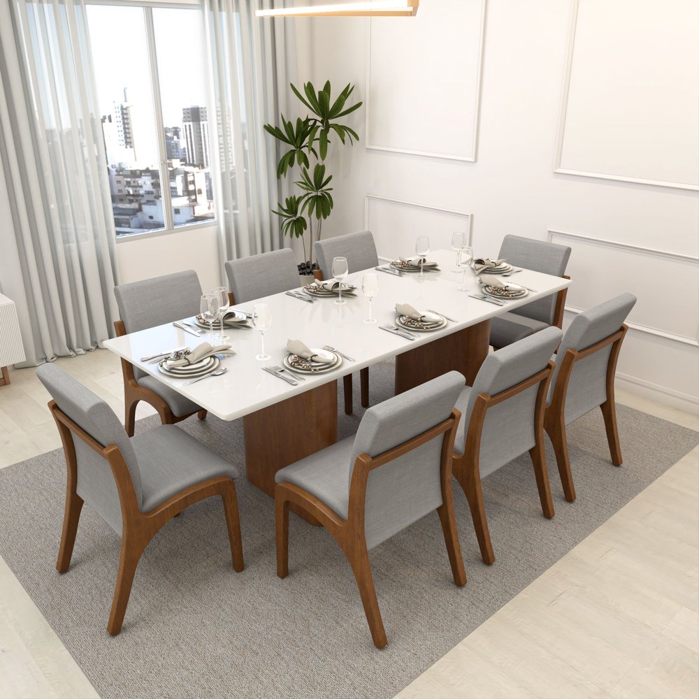 Para completar, o conjunto acompanha 8 Cadeiras Tulipa, feitas em madeira maciça tingida no amêndoa. Com design contemporâneo e estrutura sólida, elas unem resistência e sofisticação. O assento e encosto estofados em linho cinza mescla impermeável oferecem conforto no uso diário e facilidade de limpeza, tornando-as ideais tanto para jantares em família quanto para receber convidados.
