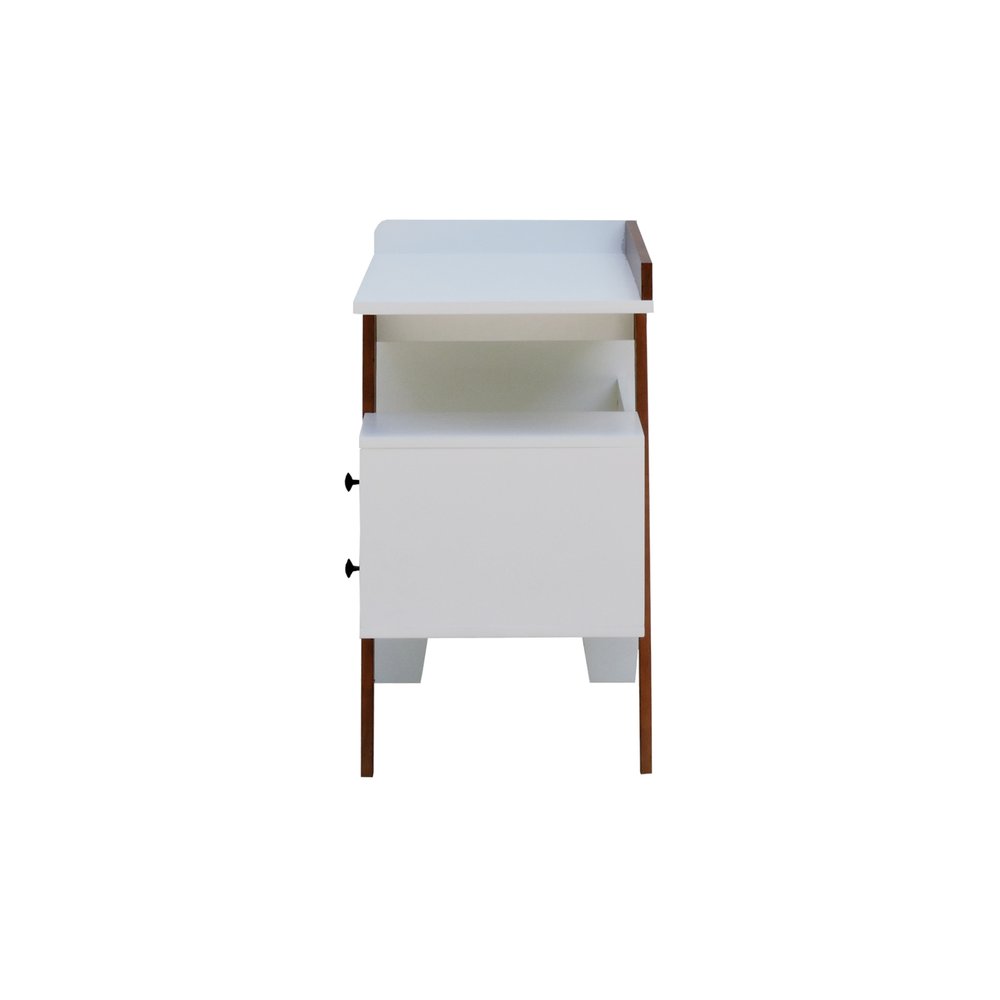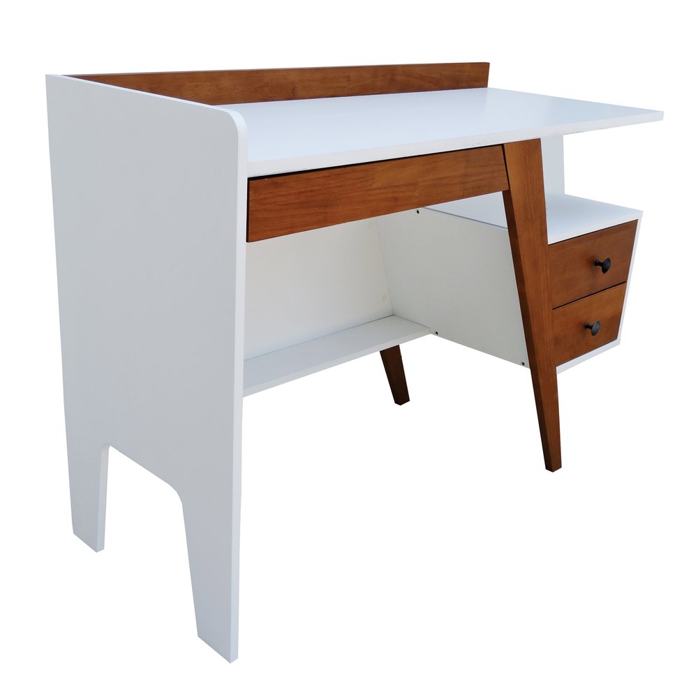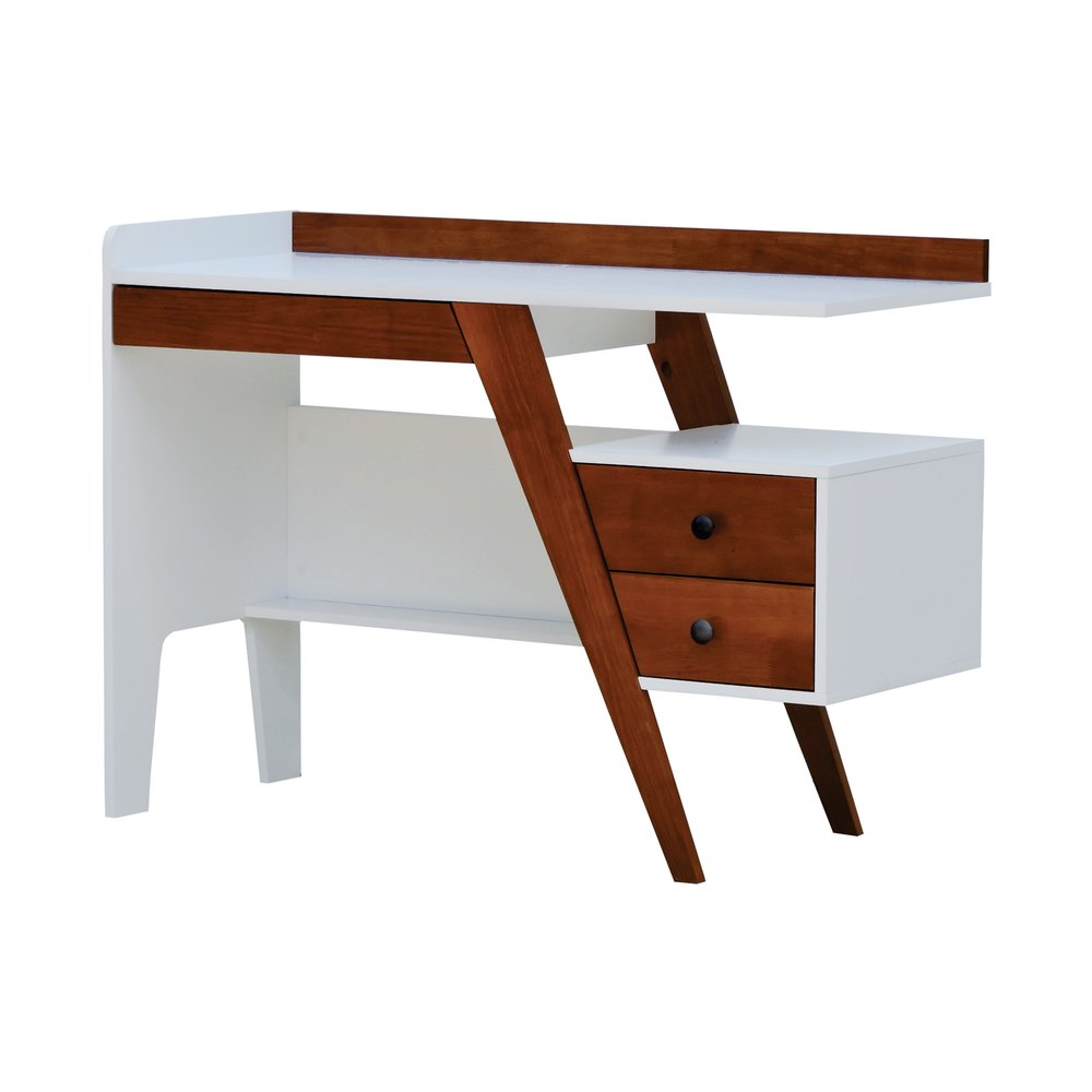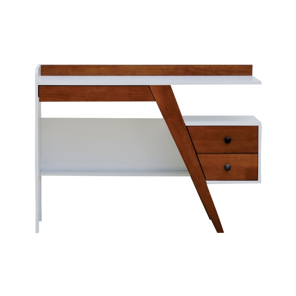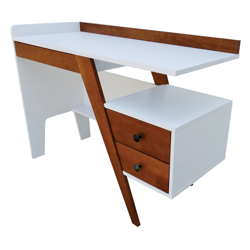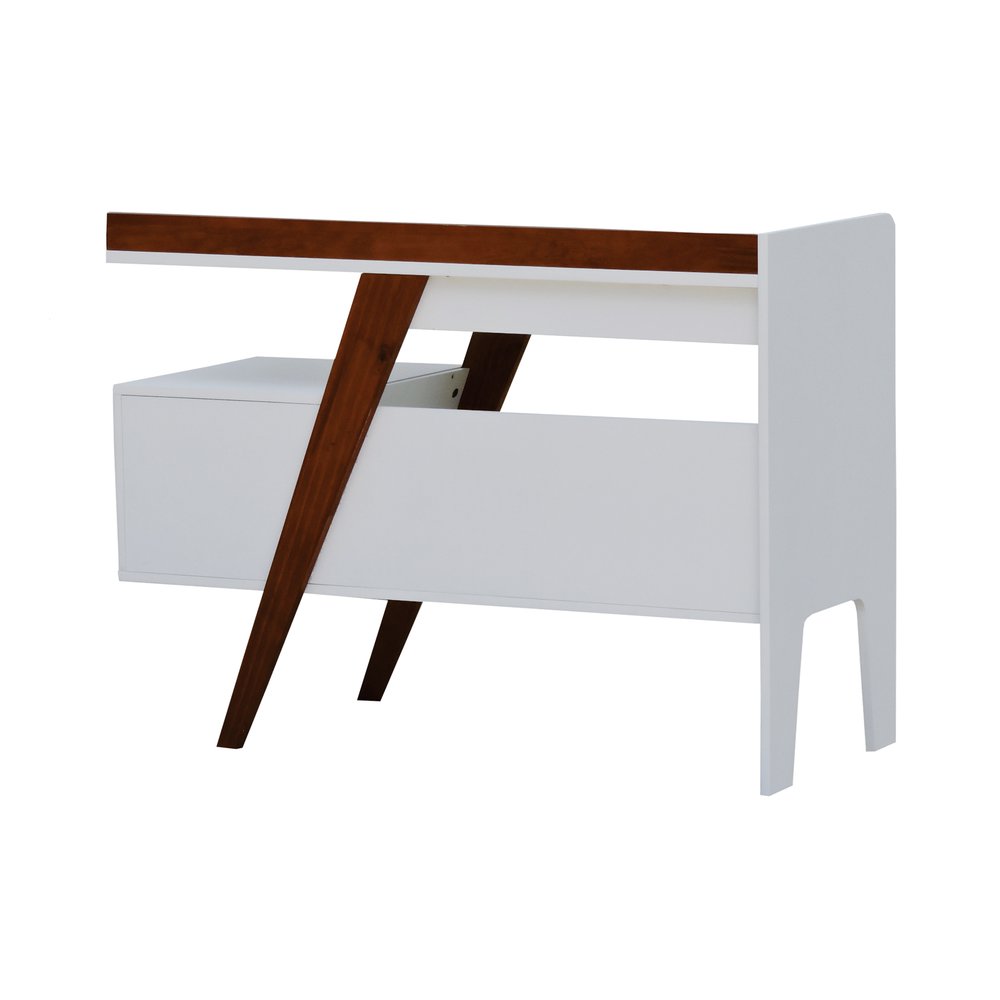 A estrutura da escrivaninha é composta por MDF laqueado de alta densidade e madeira maciça envernizada, garantindo resistência e durabilidade a longo prazo. O tampo em MDF branco contrasta com a base Amêndoa, destacando a textura natural da madeira enquanto oferece superfície lisa para apoiar notebooks, livros e objetos decorativos, sem comprometer a uniformidade do acabamento.