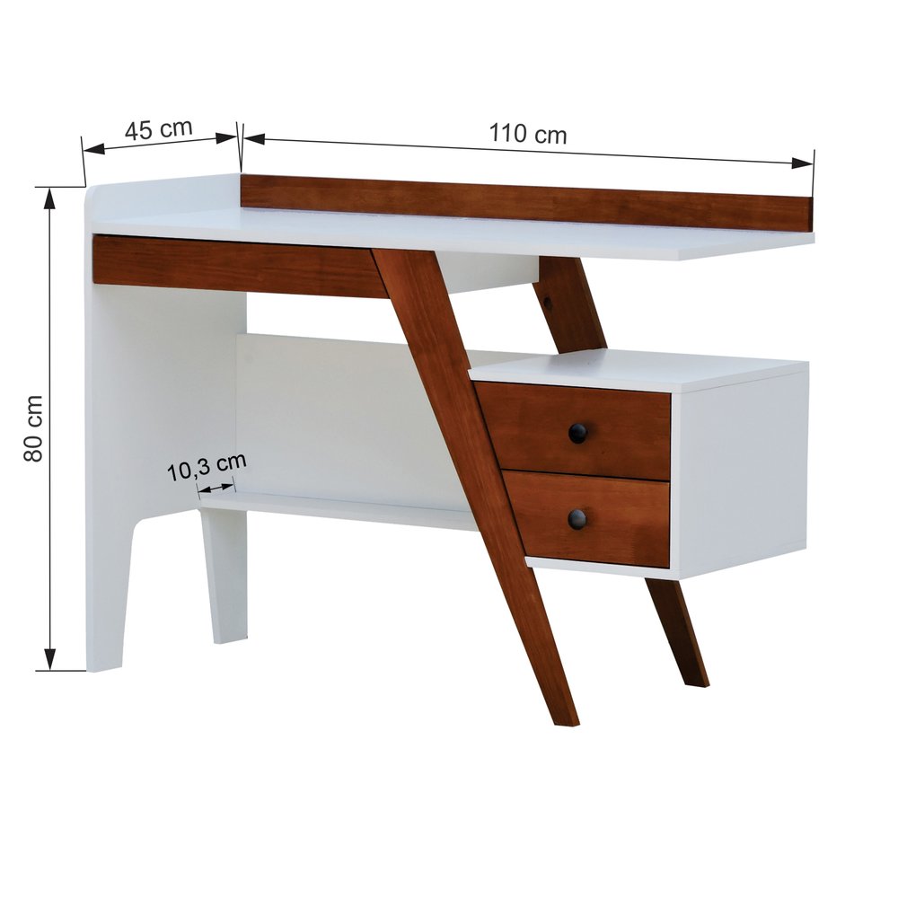 Com dimensões de 110 cm de largura, 45 cm de profundidade e 80 cm de altura, a escrivaninha oferece espaço suficiente para computador, caderno e itens de escritório. A altura de trabalho proporciona ergonomia adequada para a maioria dos usuários, evitando tensões nos ombros e punhos. Sua superfície resistente suporta até 20 kg, ideal para equipamentos eletrônicos e objetos do dia a dia.