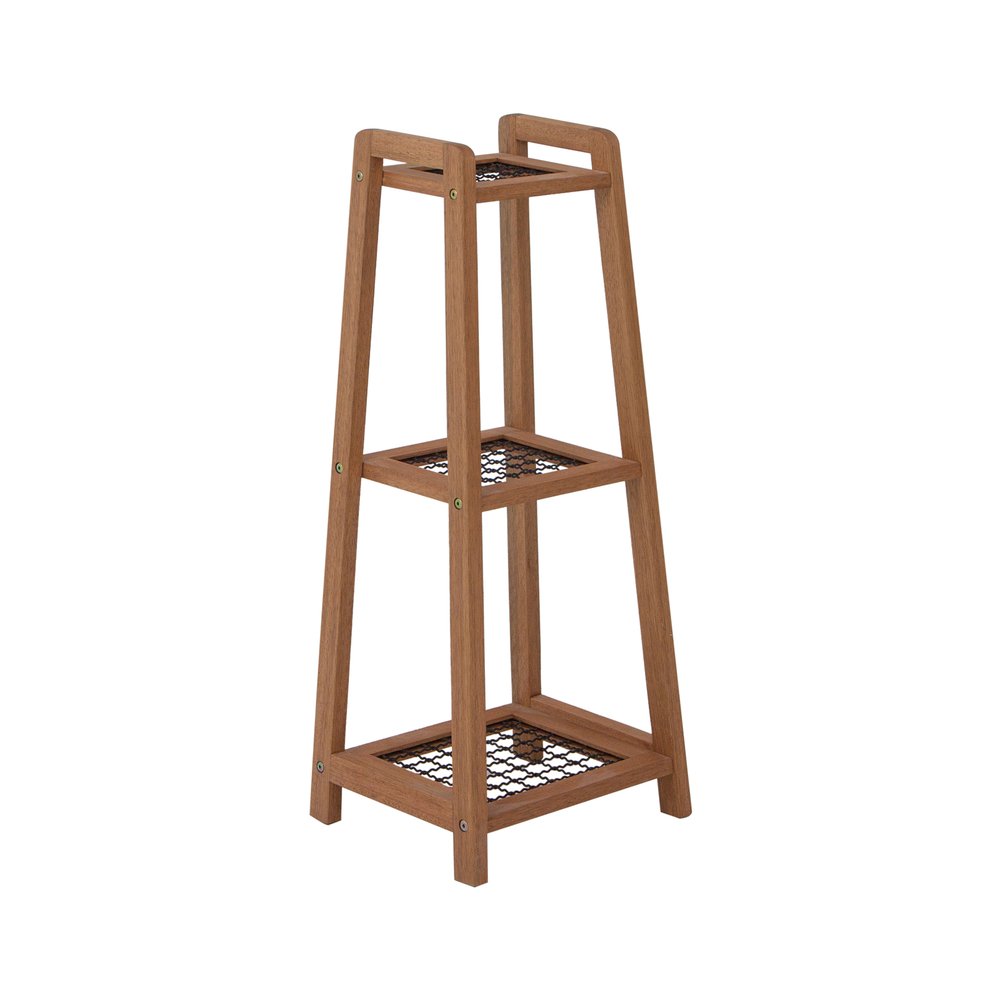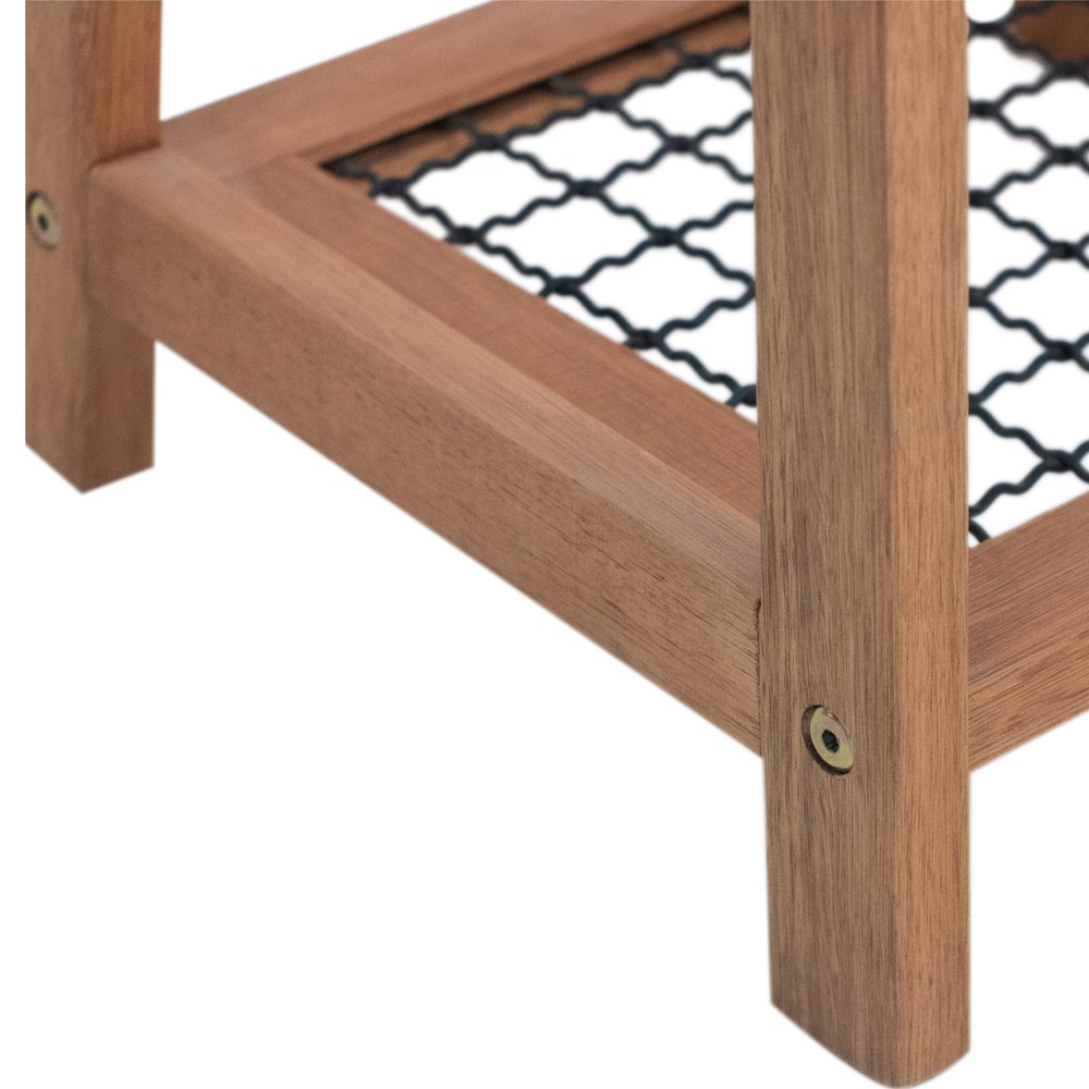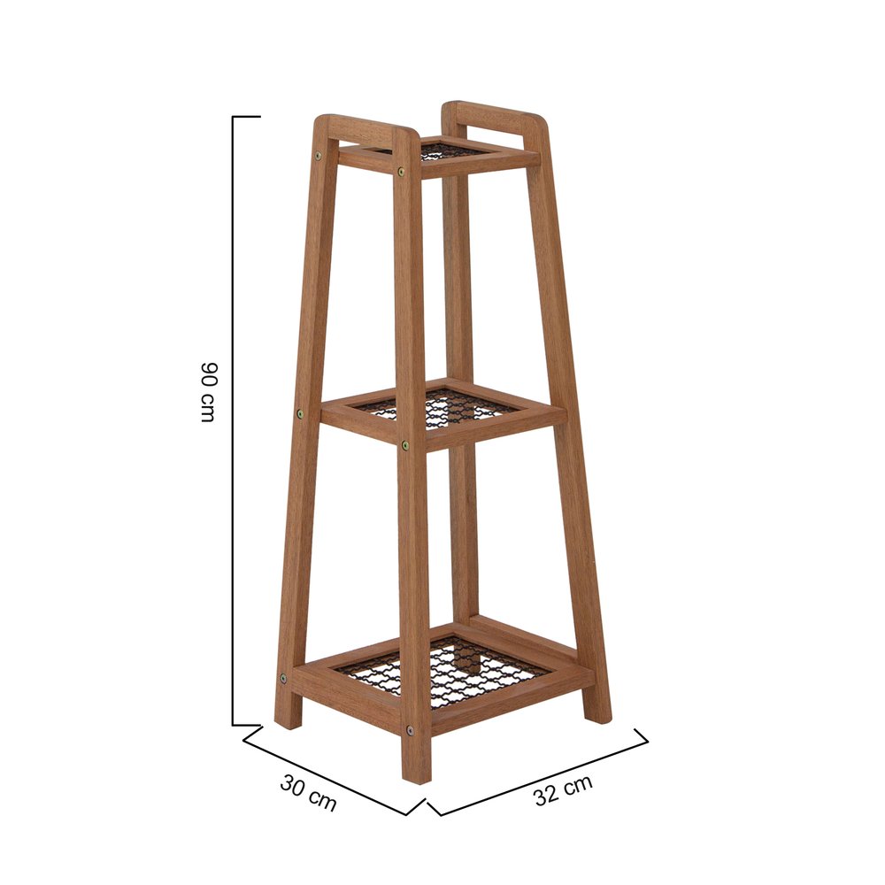 O design minimalista da Floreira Alta Garden se destaca pela combinação da madeira maciça de eucalipto, que confere estrutura robusta, e pelo painel metálico, que circunda o vaso com segurança e charme. A madeira recebe tratamento que preserva a tonalidade natural, enquanto a tela metálica pintada de preto cria contraste elegante. Esses materiais não apenas garantem durabilidade e suporte para até 20 kg, como também facilitam a manutenção, já que a superfície lisa pode ser limpa com pano úmido sem o uso de produtos químicos ou abrasivos.