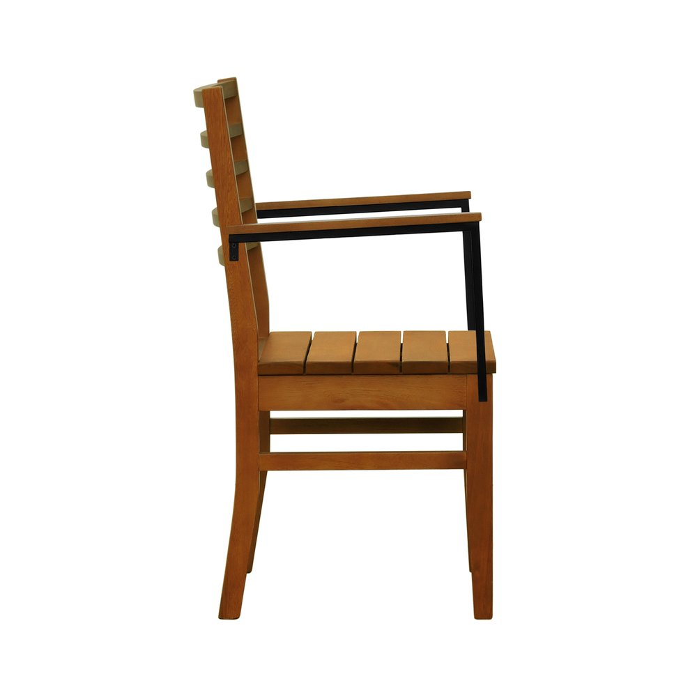 Estrutura em madeira de eucalipto maciço, assento estofado e encosto ripado, braços em aço de carbono com pintura epóxi e madeira tingida na cor amêndoa.