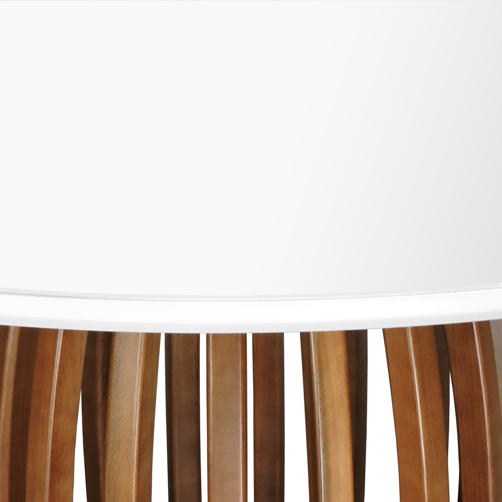 O tampo redondo, com 150 cm de diâmetro, é uma escolha perfeita para reuniões familiares ou jantares com amigos, proporcionando conforto e harmonia. O acabamento em cinamomo ou laqueado com vidro aplicado não apenas realça a beleza natural da madeira, mas também garante um toque moderno e sofisticado ao ambiente.