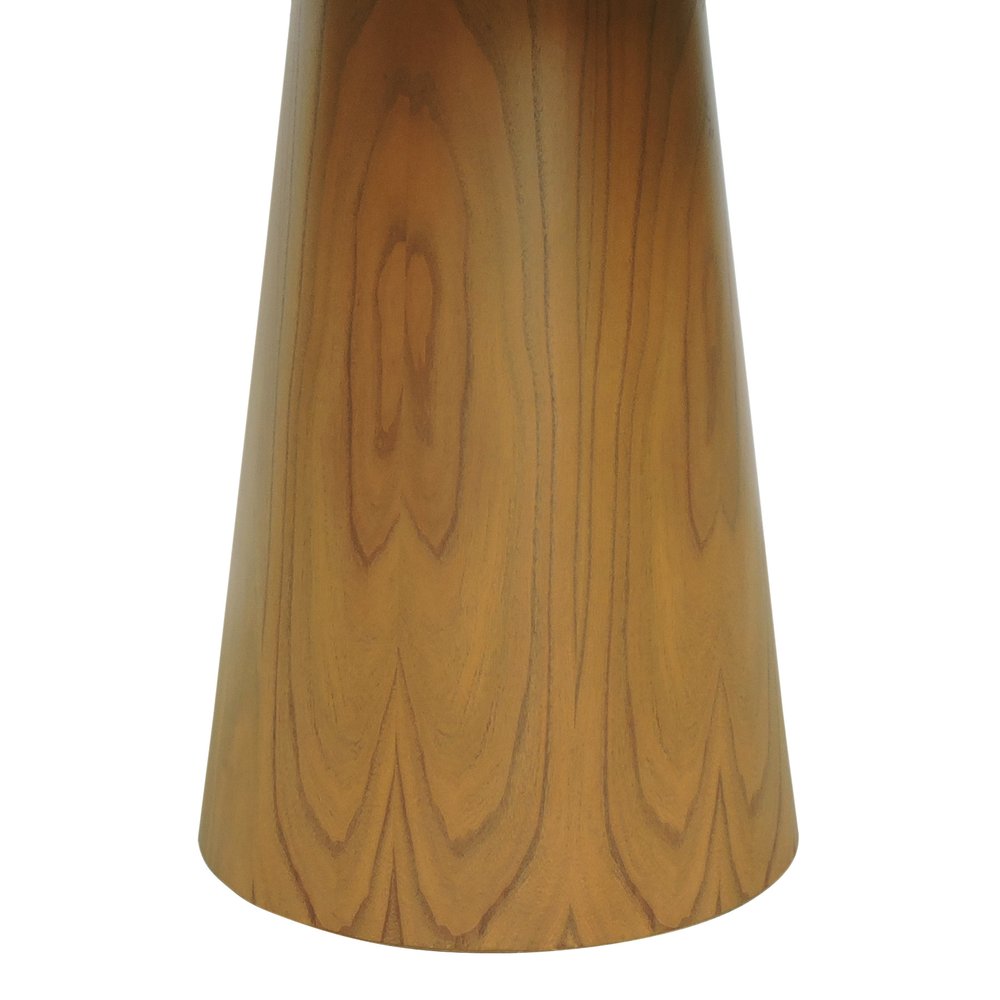 A base cônica da mesa é confeccionada em cone anatômico multilaminado, revestido com lâmina de cinamomo tingida na cor amêndoa ou natural. Esse acabamento proporciona um aspecto amadeirado que traz aconchego ao ambiente. O tampo redondo de 120 cm de diâmetro é composto por MDF laqueado branco, com aplicação de vidro temperado branco, conferindo um toque de elegância e facilitando a limpeza.