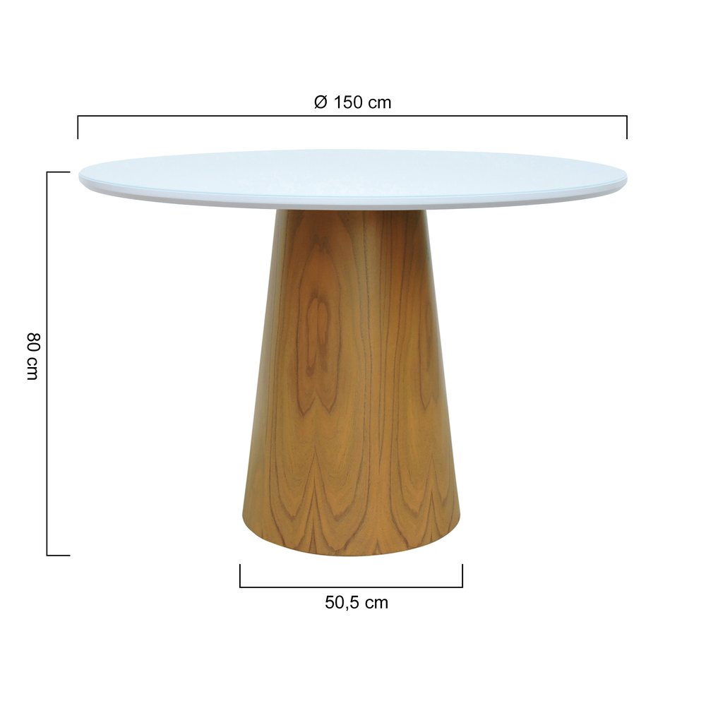 O design da Mesa Base Cone é marcado por linhas suaves e uma estética minimalista que se adapta facilmente a diversos estilos de decoração. A base em formato cônico, confeccionada em cone anatômico multilaminado com revestimento em lâmina de cinamomo tingida na cor natural, confere um toque de sofisticação e leveza à peça. O tampo redondo de 150 cm de diâmetro, em MDF laqueado com aplicação de vidro branco, complementa o visual moderno e clean, proporcionando um ambiente harmonioso e convidativo.
