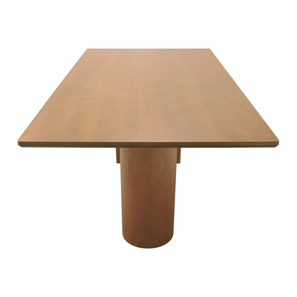 Destaque no design e na estrutura, a base em formato de meia-lua confere personalidade e sofisticação à mesa. Composta por duas peças sobrepostas — uma menor e outra maior — ela cria um efeito visual marcante e fluido. A parte interna é feita em madeira maciça, garantindo robustez e durabilidade, enquanto o revestimento em multilaminado tingido no tom amêndoa adiciona um toque acolhedor e refinado à composição.