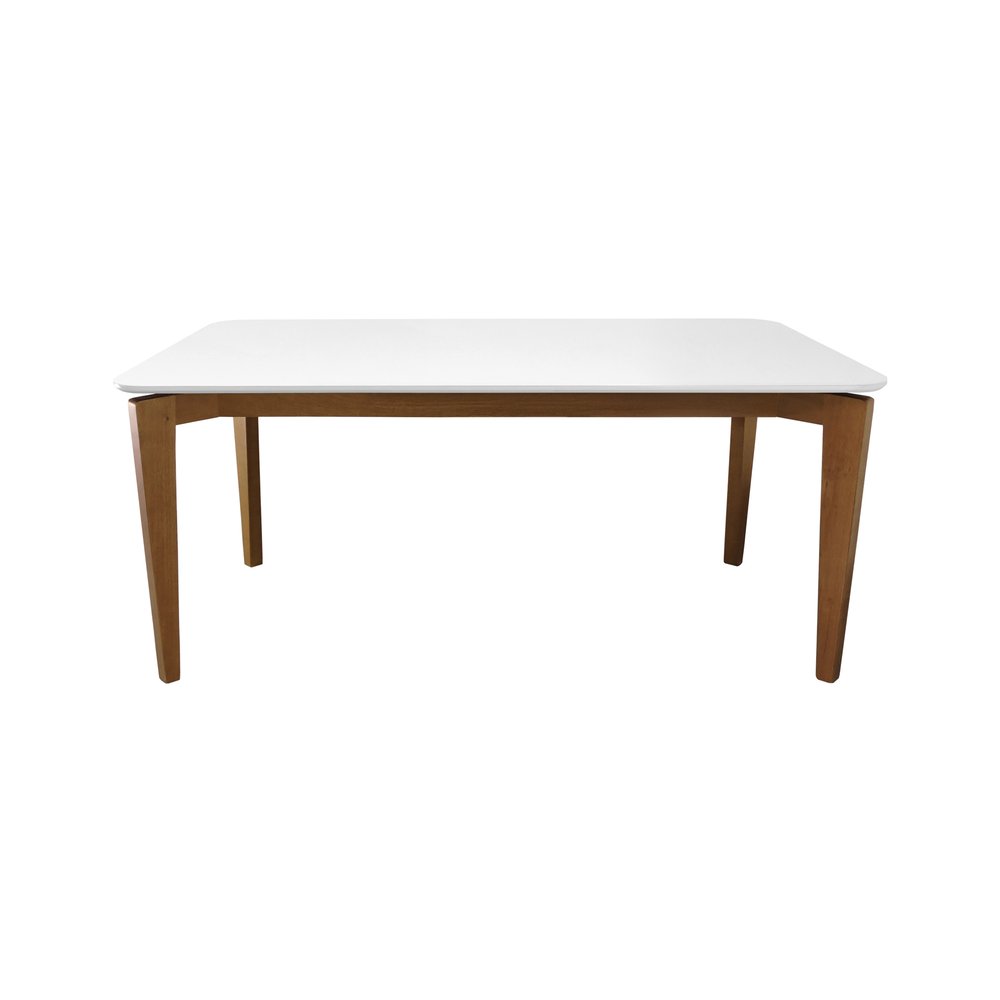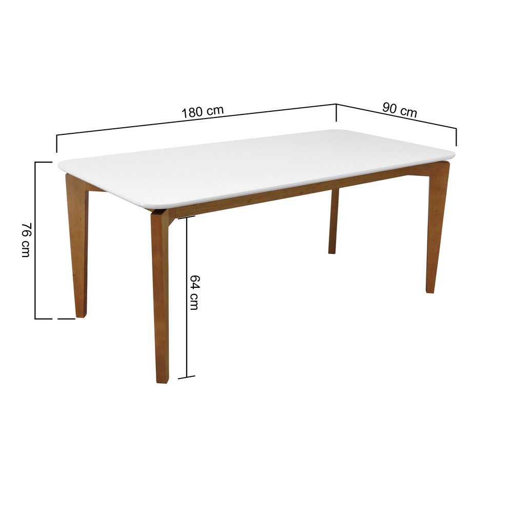 O tampo mede 180x90cm, ideal para reunir a família e amigos com conforto. Disponível em duas opções de acabamento: MDF com lâmina natural de cinamomo, que valoriza os veios da madeira, ou MDF laqueado branco com sobreposição em vidro off white, que traz um ar contemporâneo e sofisticado. As bordas levemente curvadas suavizam o visual e agregam elegância ao design.