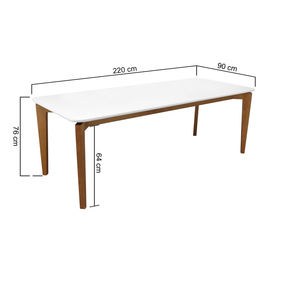 Com generosas dimensões de 220x90cm, é ideal para quem valoriza encontros com mais pessoas e deseja um móvel que una conforto e imponência. O tampo está disponível em duas opções: MDF com lâmina natural de cinamomo, que destaca a beleza dos veios da madeira, ou MDF laqueado branco com vidro off white, que adiciona um ar moderno e refinado. As bordas com curvatura suave completam o design sofisticado.