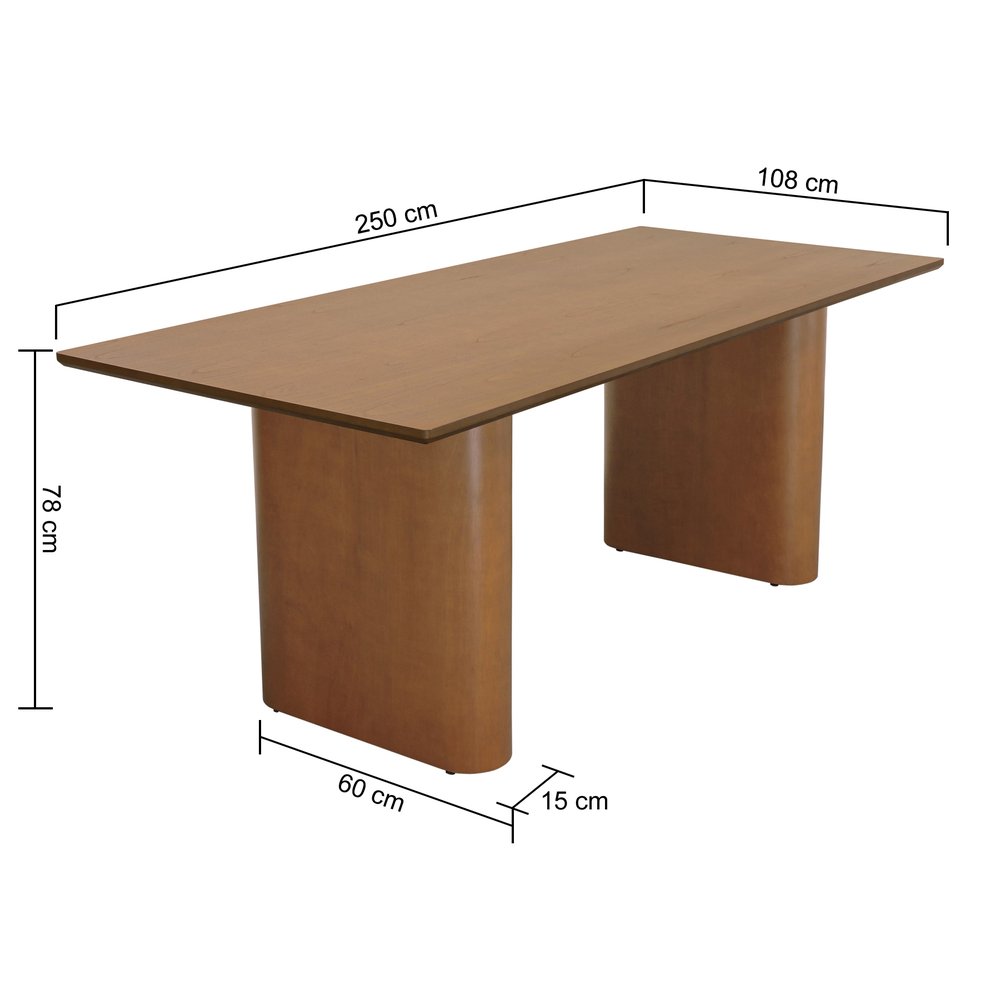 Sua base robusta e marcante é composta por estrutura em madeira maciça envolta em multilaminado, também tingido no amêndoa, proporcionando não apenas resistência e durabilidade, mas também um visual fluido e sofisticado, com cantos levemente arredondados que agregam leveza ao conjunto.