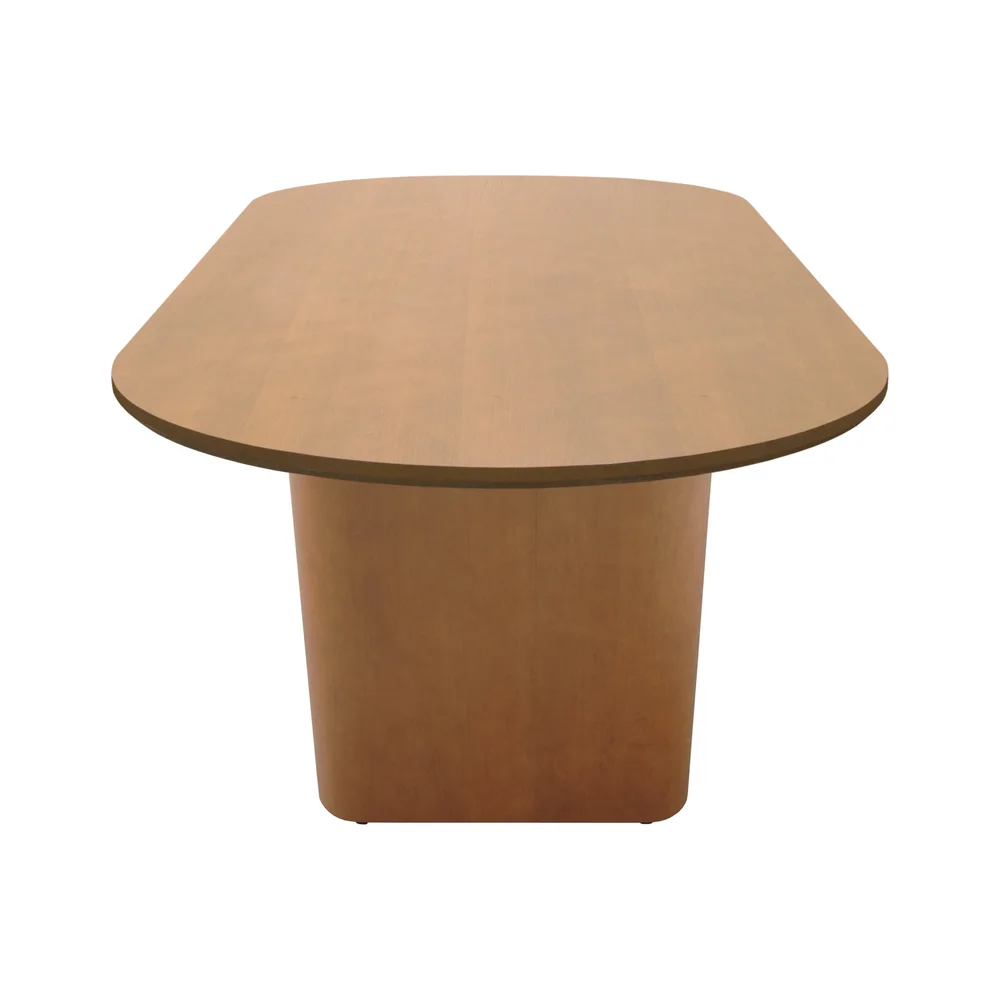 A base é composta por uma robusta estrutura em madeira maciça envolta em multilaminado curvo, também tingido no tom amêndoa, garantindo durabilidade e um visual marcante que se destaca pelo acabamento de alto padrão.