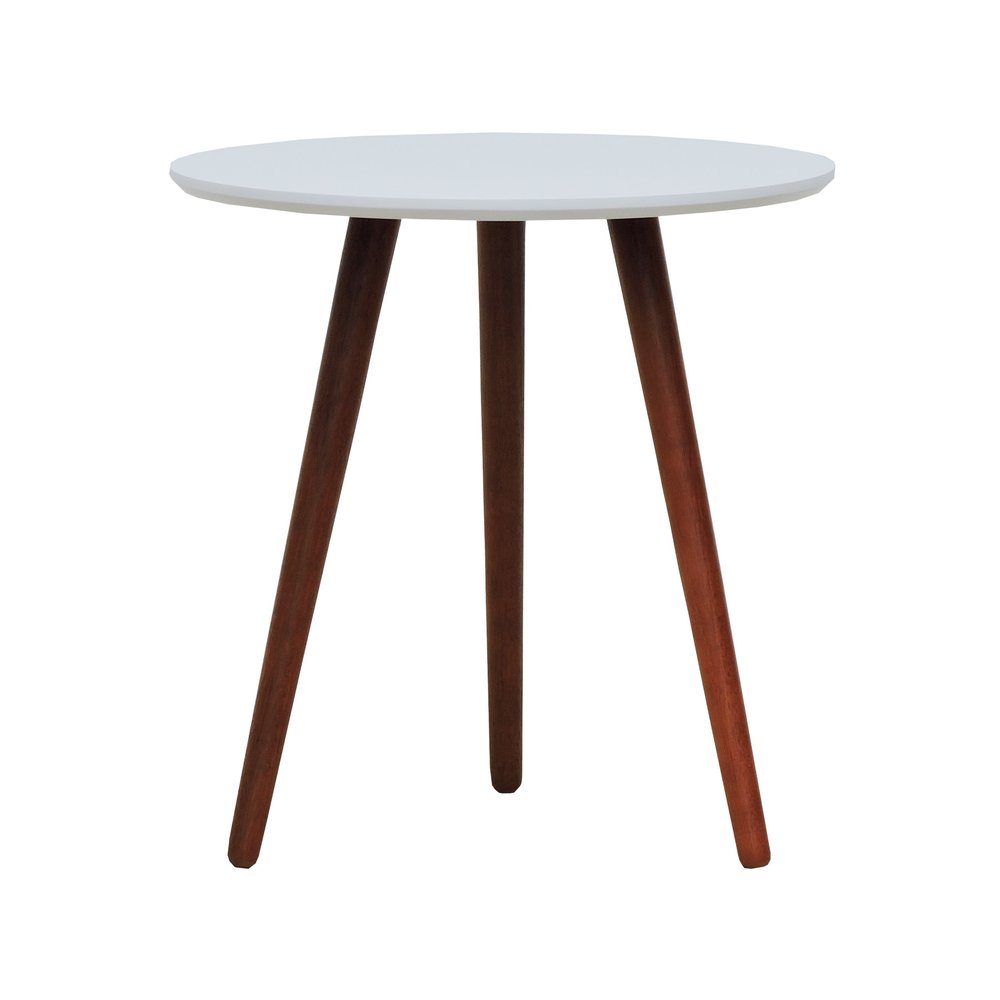 Mesa Lateral Tripé Tampo MDF e Pés Madeira Eucalipto Maciço Amêndoa Branco