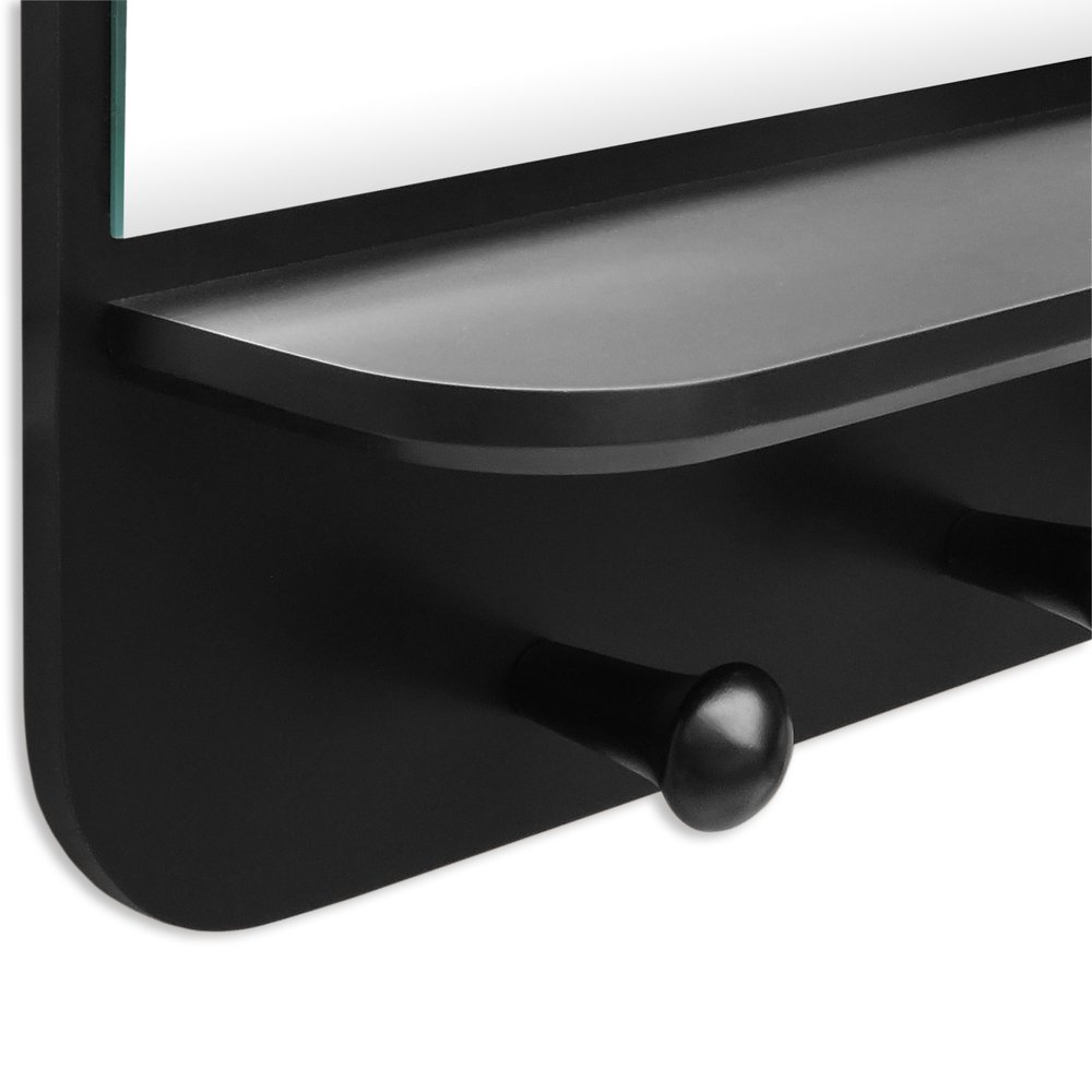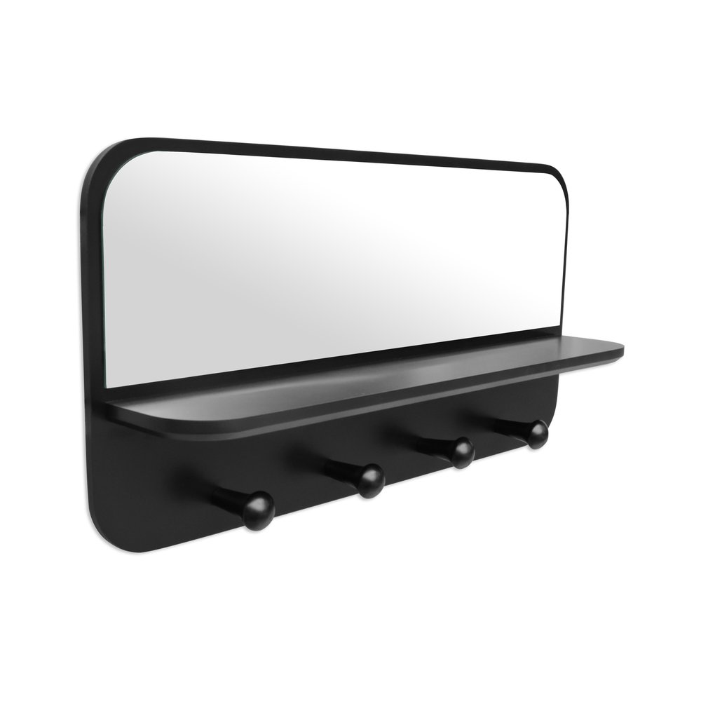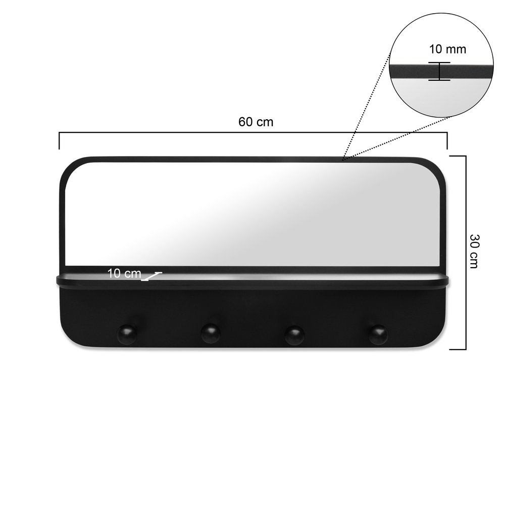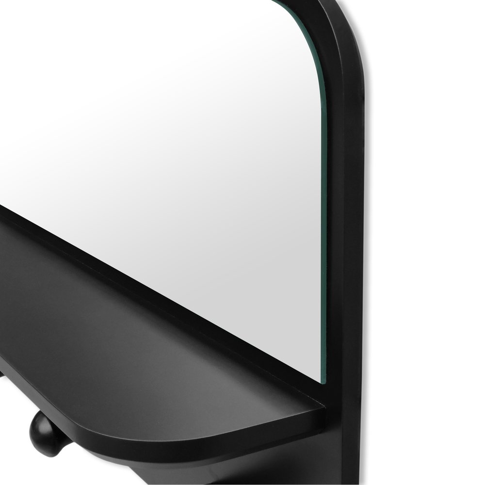 Fabricada em MDF laminado ou laqueado de 15mm, a prateleira apresenta acabamento na cor preta, conferindo um toque moderno e versátil que se adapta a diferentes estilos de decoração. O espelho integrado possui 3mm de espessura, proporcionando reflexos nítidos e ampliando a sensação de espaço no ambiente.
