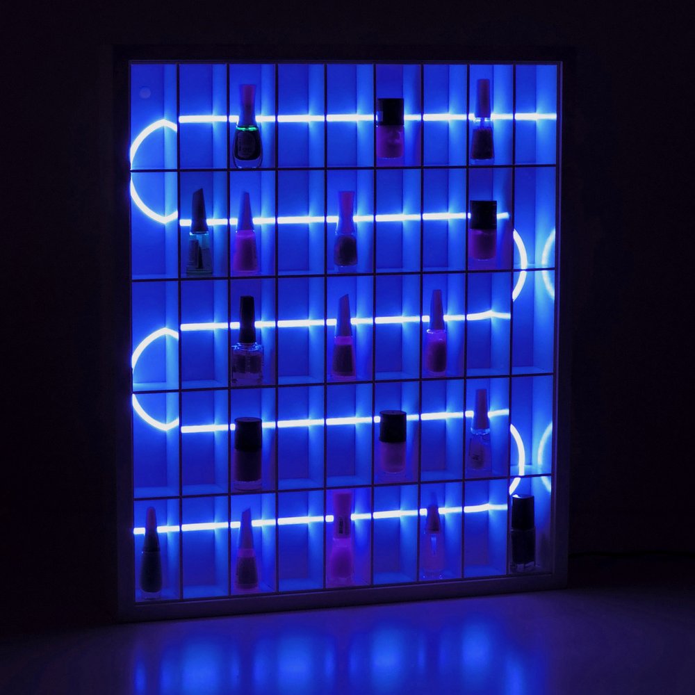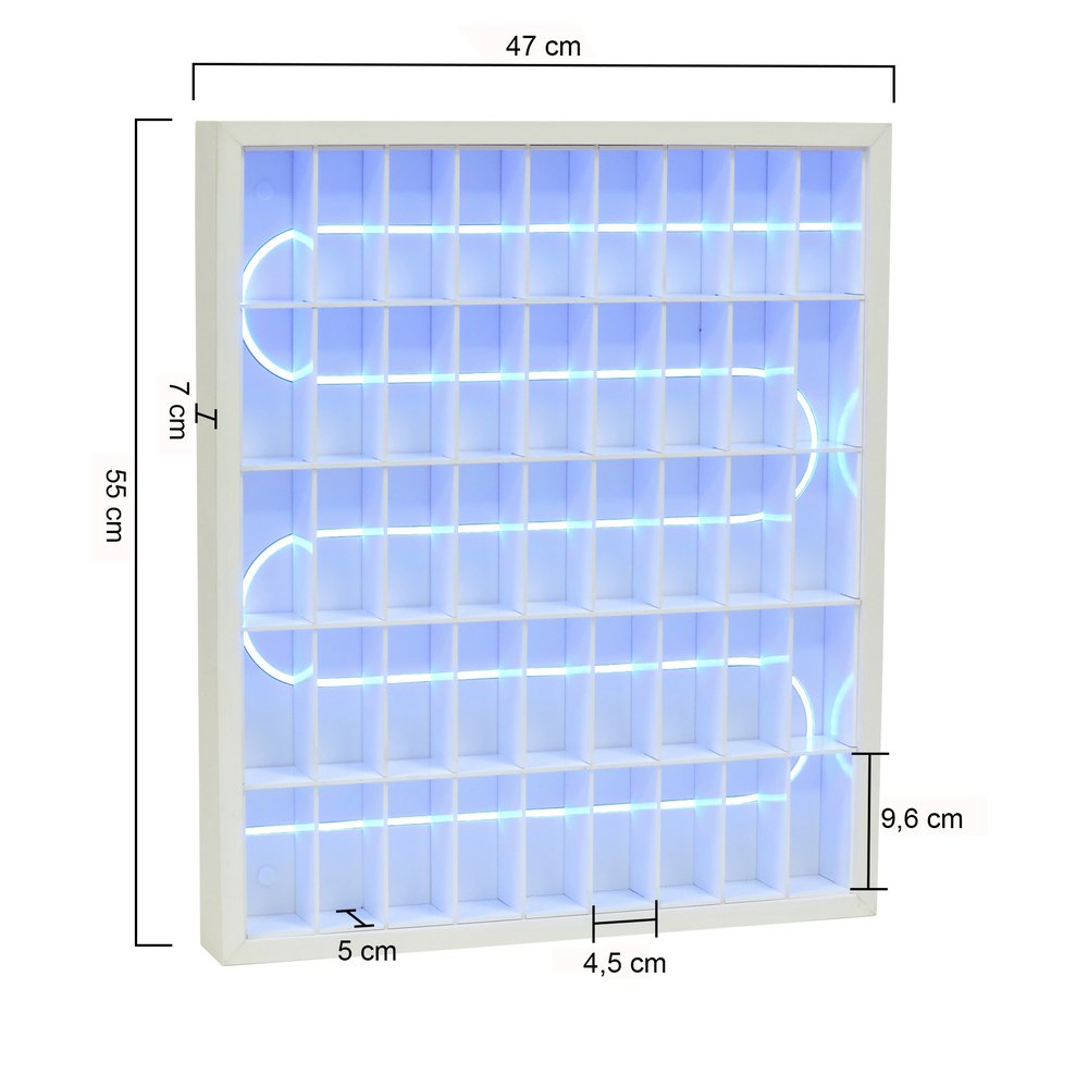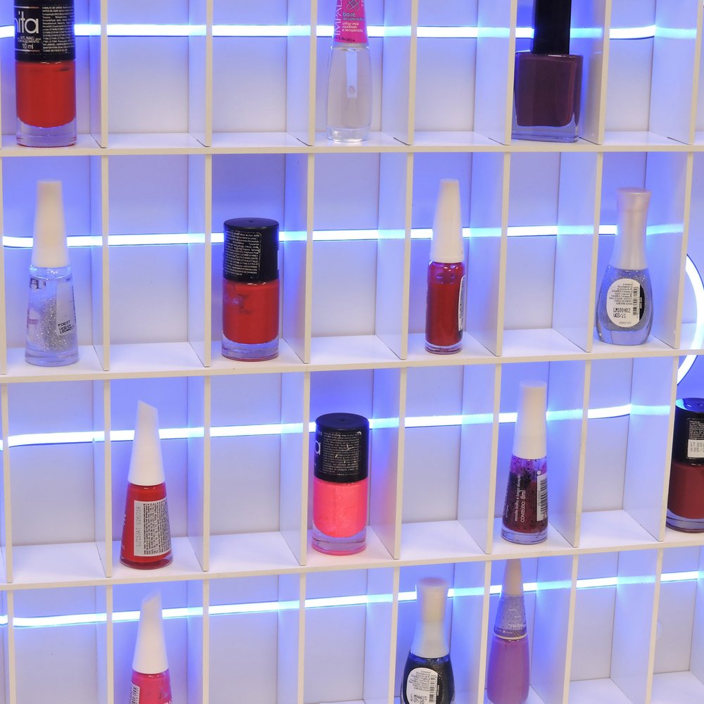 Além de organizar esmaltes, a prateleira é perfeita para expor miniaturas, cosméticos, velas e outros objetos pequenos. Seu design com bordas evita que os itens rolem, garantindo segurança e praticidade. A combinação da base branca com a iluminação azul cria um ponto de destaque em qualquer parede, tornando a prateleira ideal para salões de beleza, estúdios de manicure, closets e até mesmo escritórios criativos e home theaters.