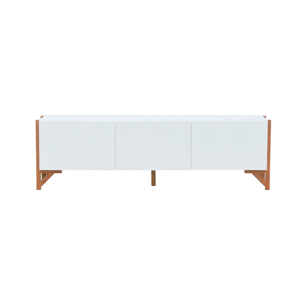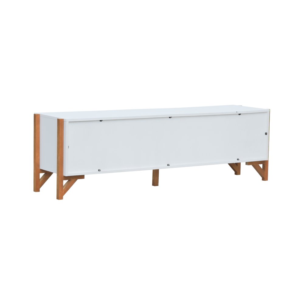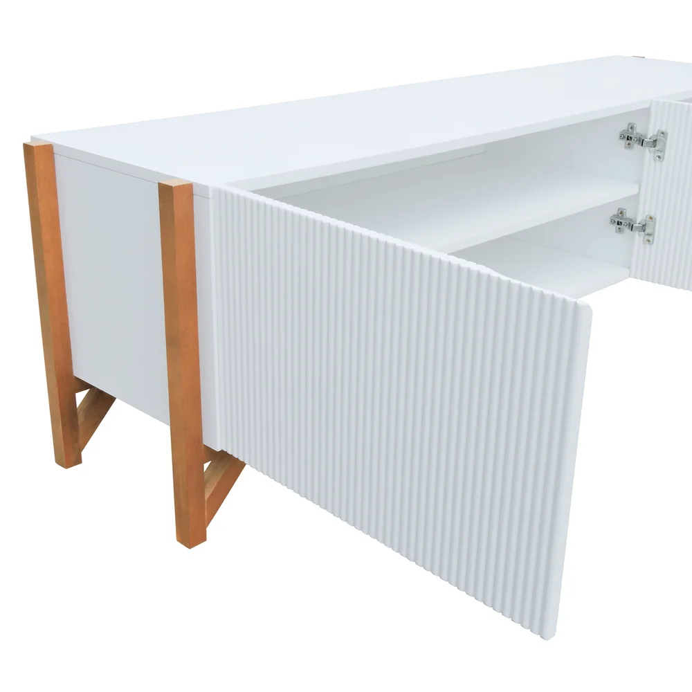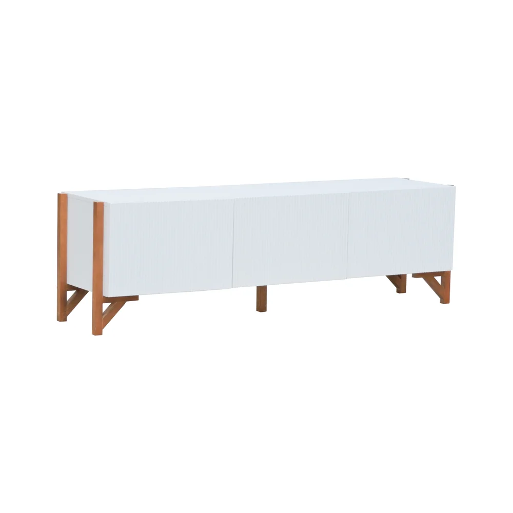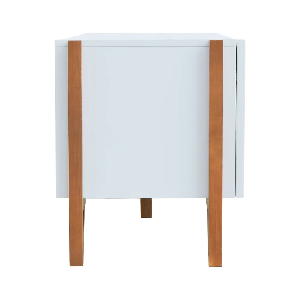 Produzido em MDF laqueado resistente e pés em madeira maciça envernizada, este rack combina solidez estrutural com estética refinada. O revestimento Off-White/Amêndoa apresenta tonalidade uniforme e superfície acetinada, conferindo sofisticação e facilitando a limpeza diária. A madeira maciça nos pés adiciona um toque de naturalidade e garante maior estabilidade ao conjunto, suportando até 30 kg distribuídos uniformemente.